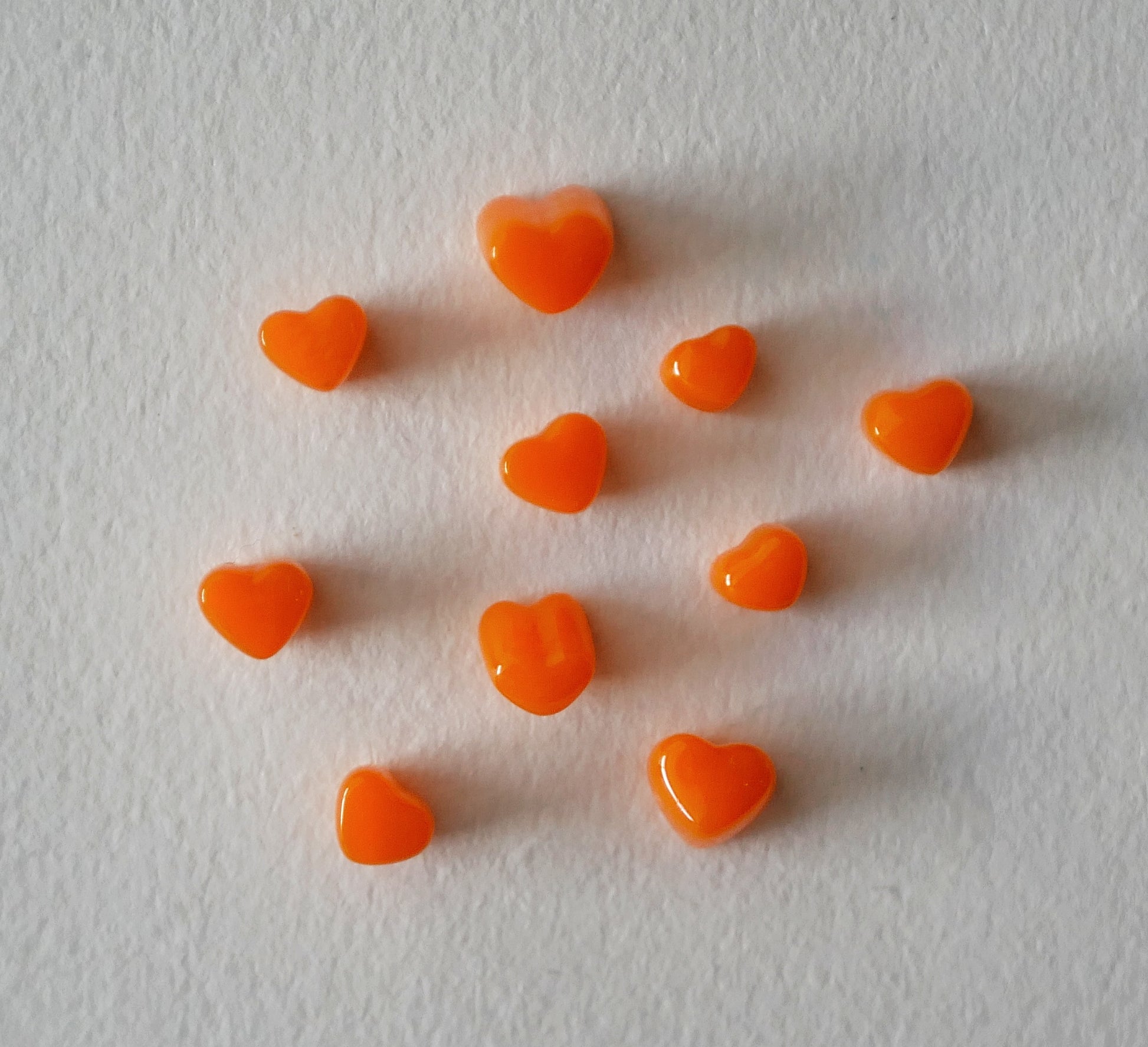 A small collection of tiny glass hearts. For use as game tokens, for arts and glass projects, or for whatever else you can think of!