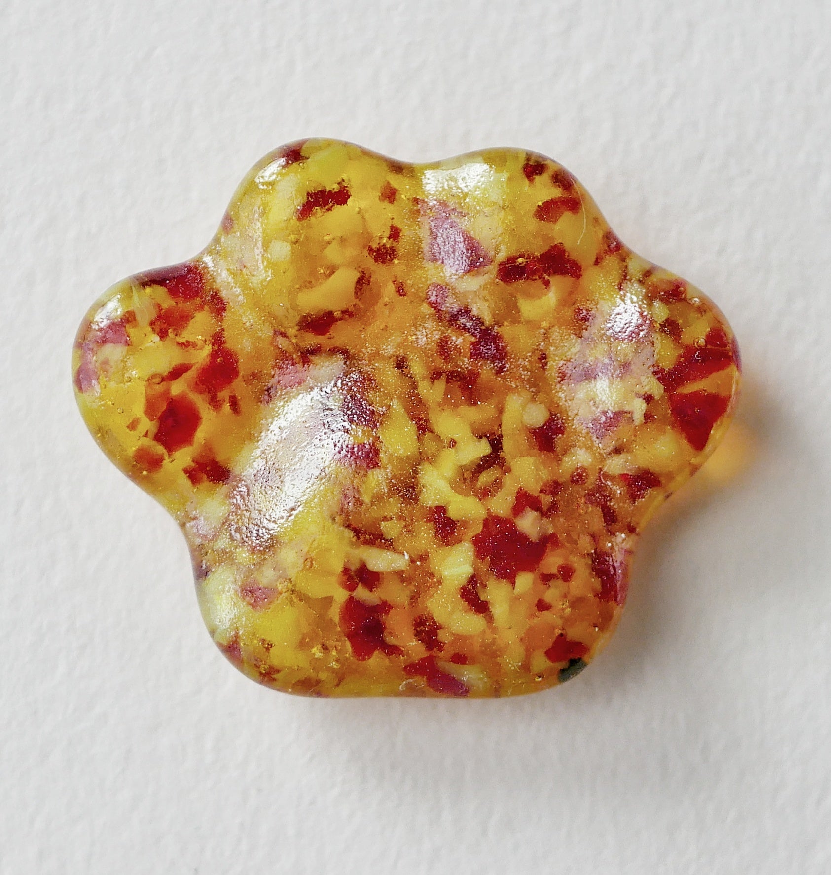 A piece of handmade fused glass in the shape of a paw, great as a gift to remind someone you love them.