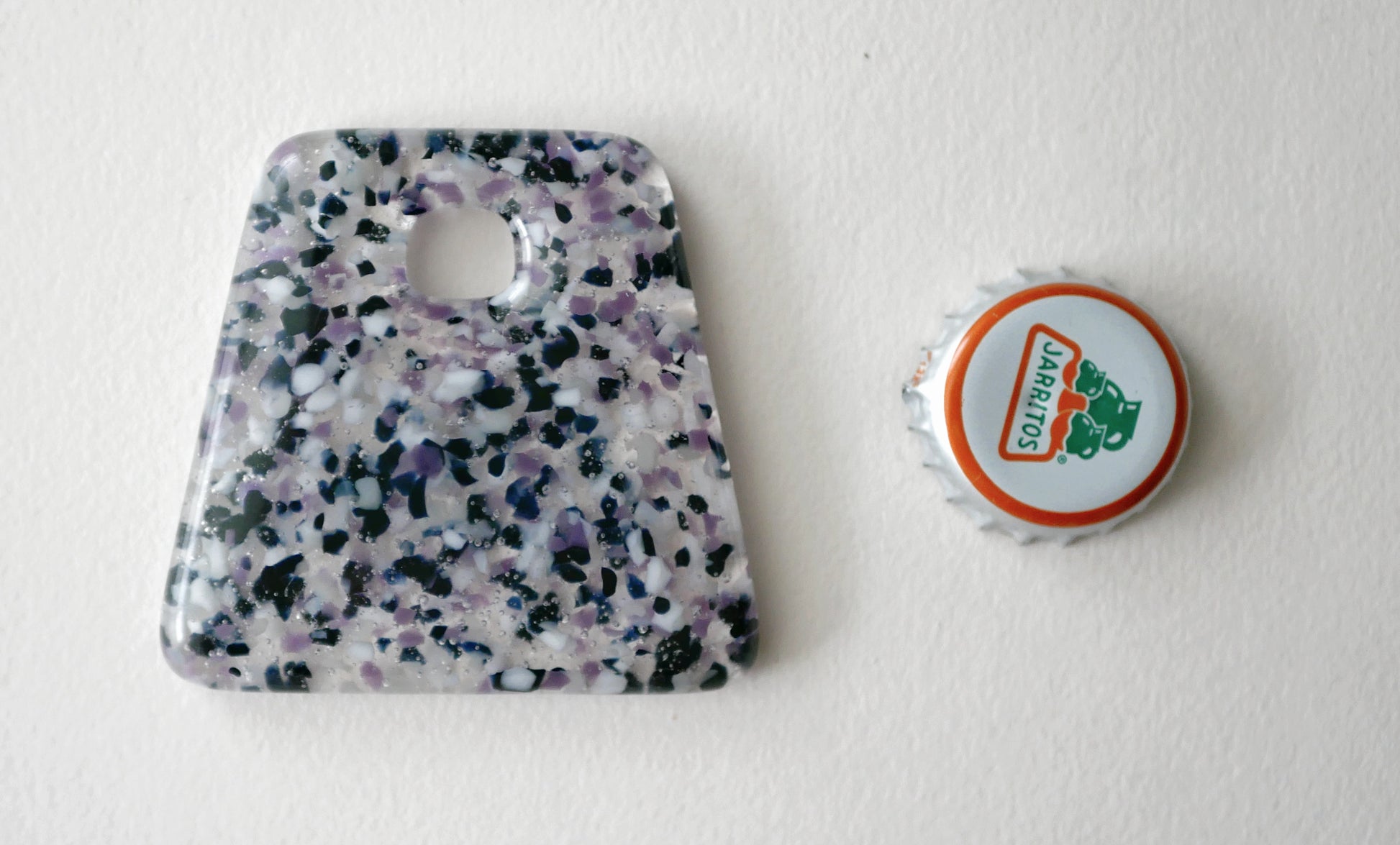 Handmade in my kiln by me. There's a few of these that have slightly different patterning, you may not receive the exact one in the picture.