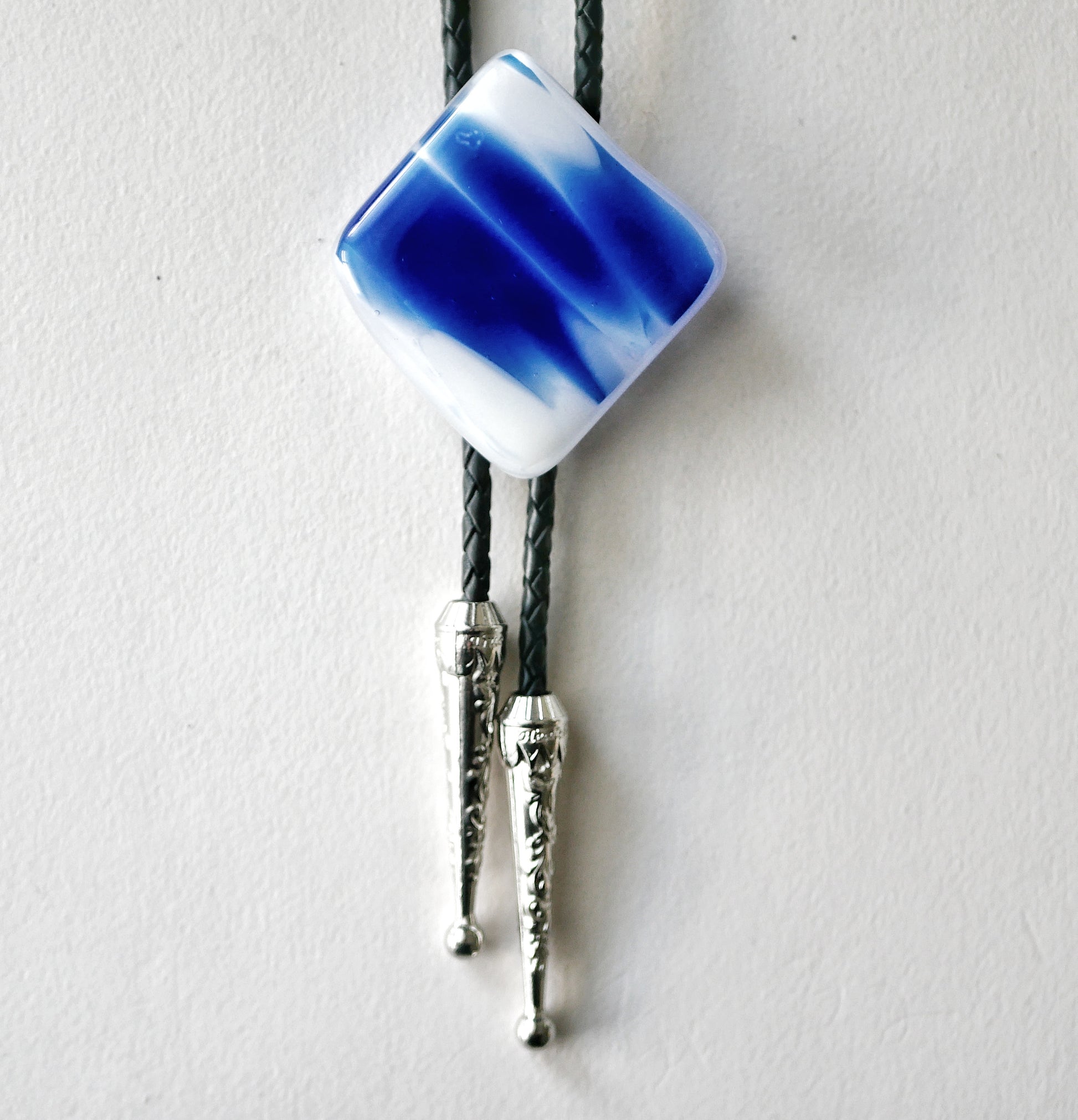 A fused glass cabochon on a 42 inch leather bolo tie with a flat back so it sits nicely under your collar. Base metal findings.