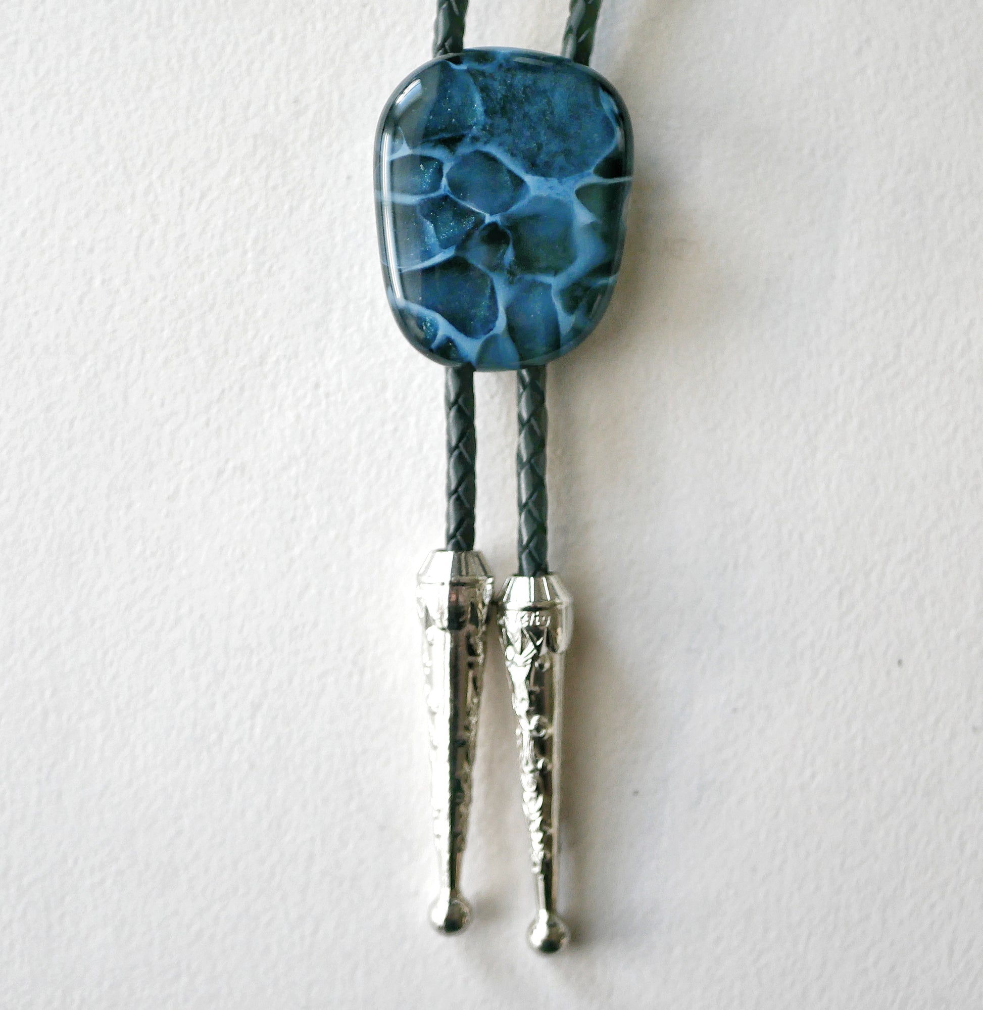 A fused glass cabochon on a 42 inch leather bolo tie with a flat back so it sits nicely under your collar. Base metal findings.