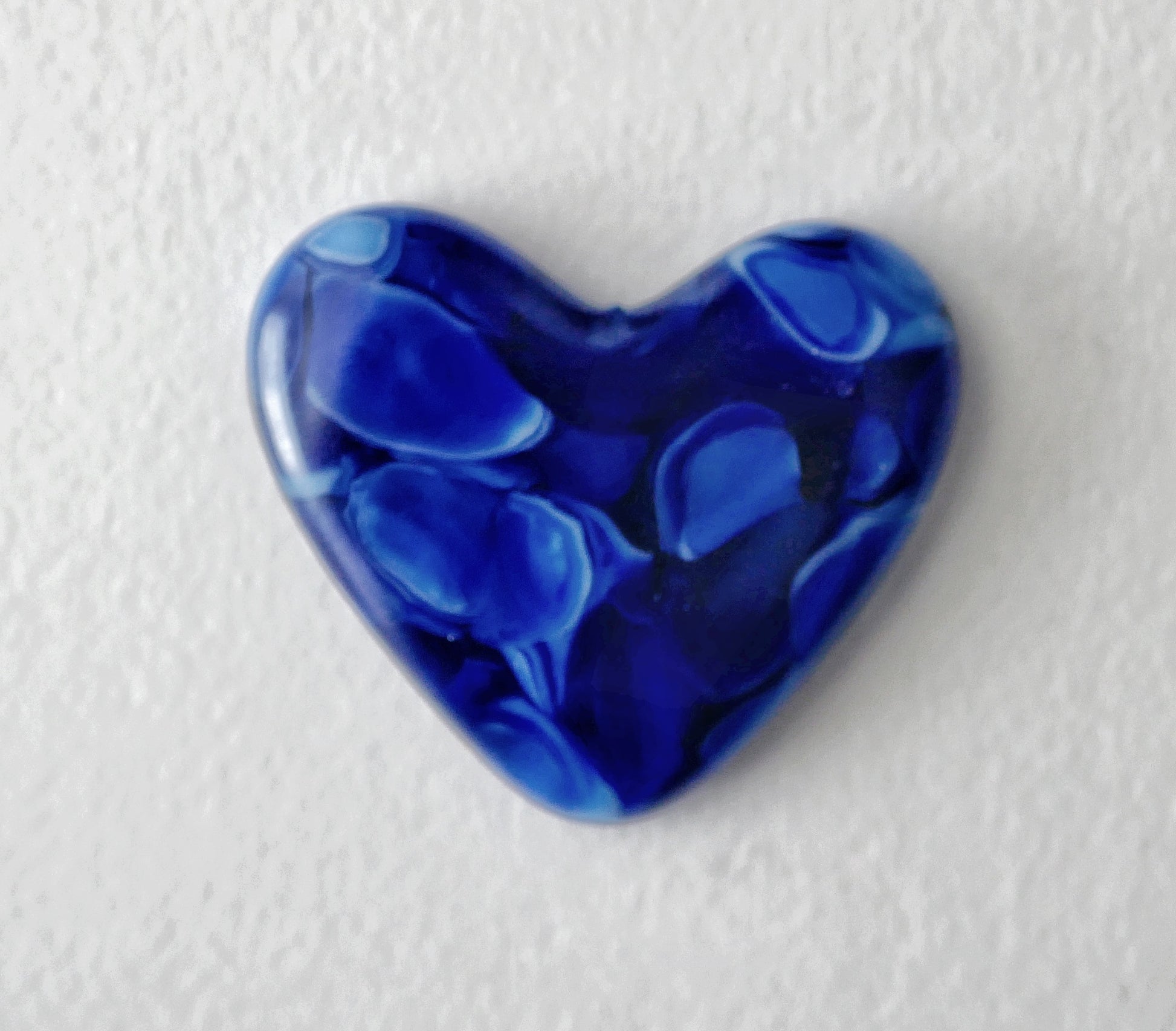 A piece of handmade fused glass in the shape of a heart, great as a gift to remind someone you love them.