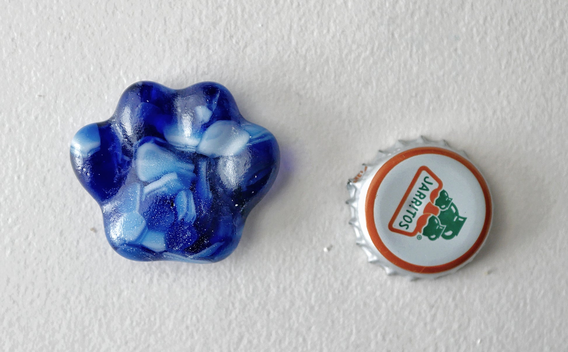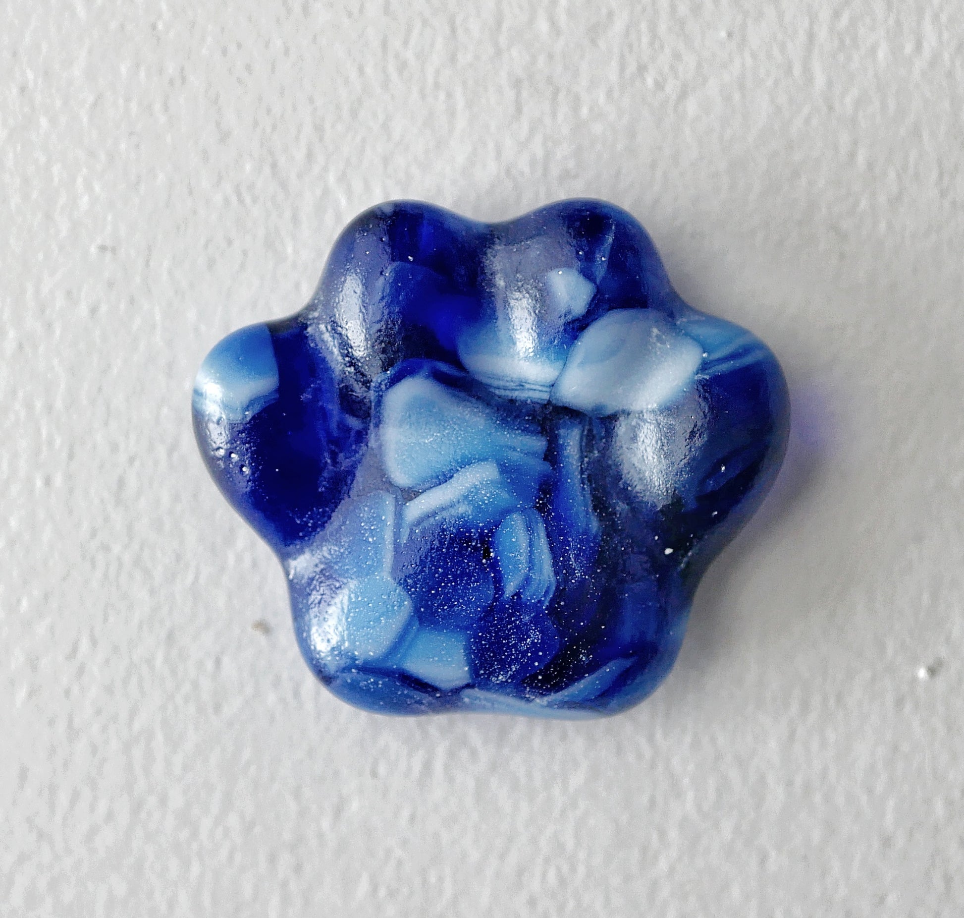 A piece of handmade fused glass in the shape of a paw, great as a gift to remind someone you love them.