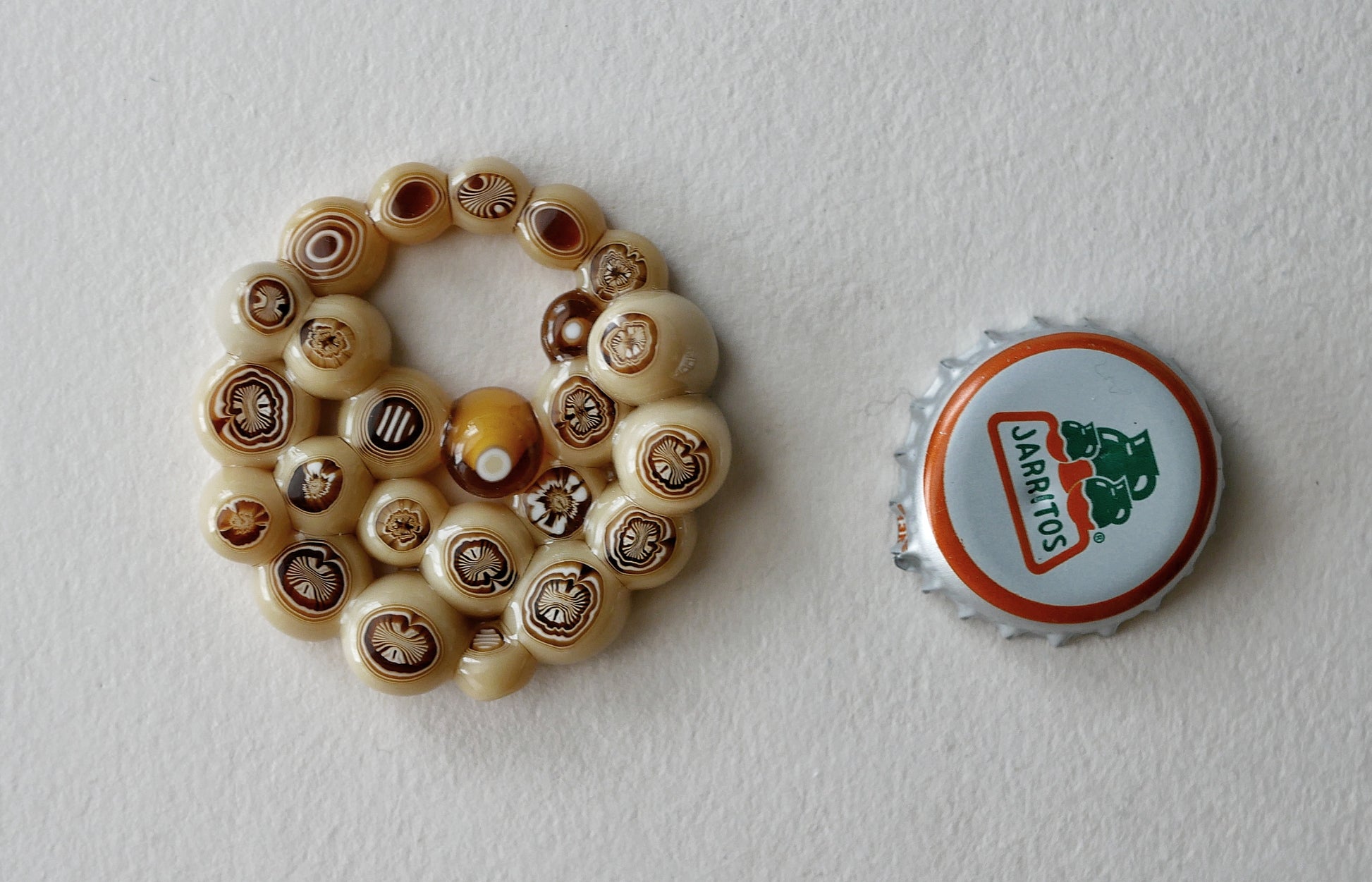 Handmade in my kiln by me! This one uses murrine cane that has been rounded but not fully melted, making the final piece bumpy. Because of this it has thinner parts and the joinings are a little bit less sturdy; you're going to want to be extra careful with it.