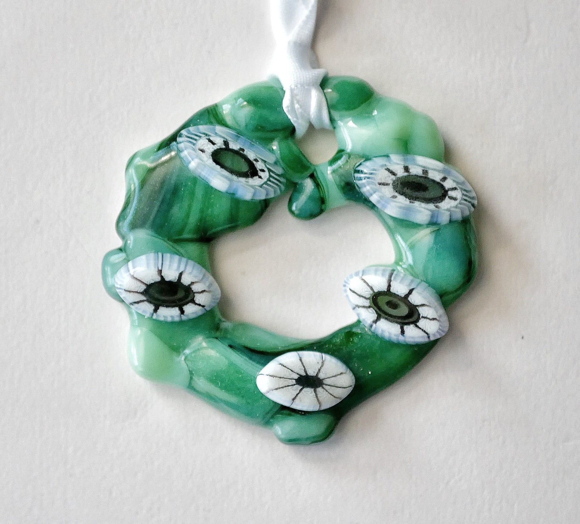 Handmade in my kiln by me! These work nicely as Christmas tree ornaments but also look good hanging on a wall or in a window. They come with a loop of ribbon for hanging.