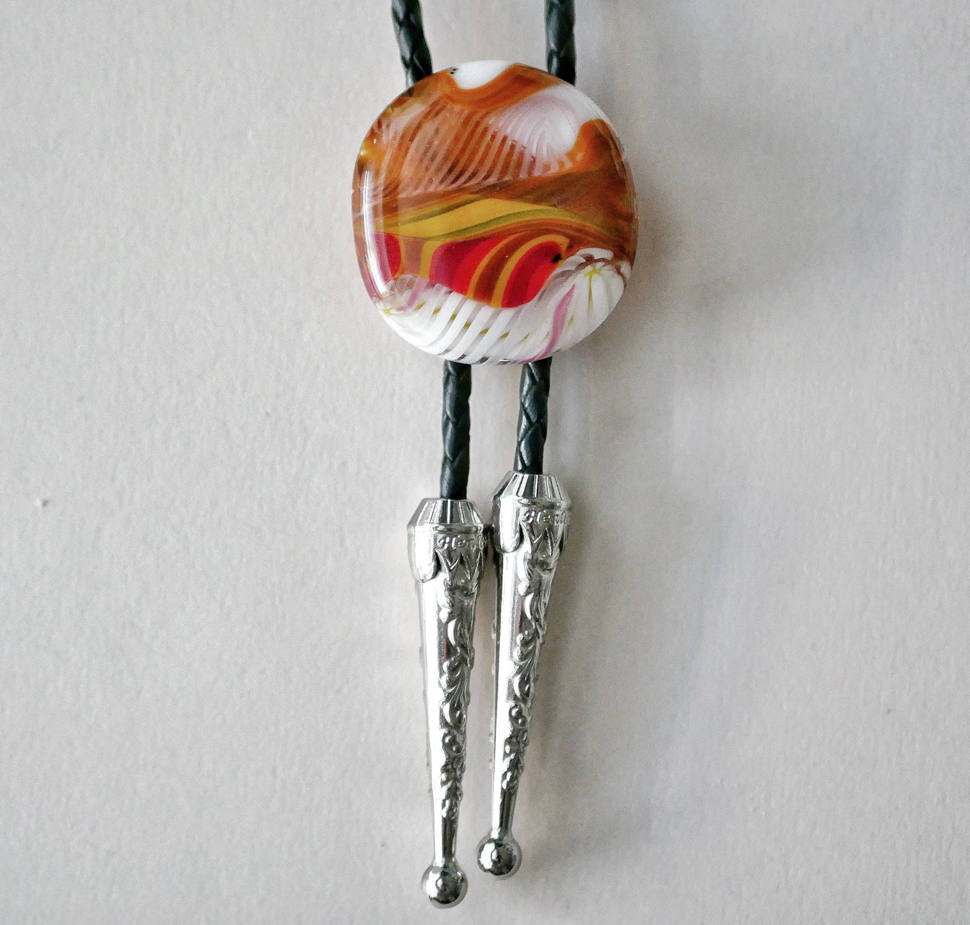 A fused glass cabochon on a 42 inch leather bolo tie with a flat back so it sits nicely under your collar. Base metal findings.