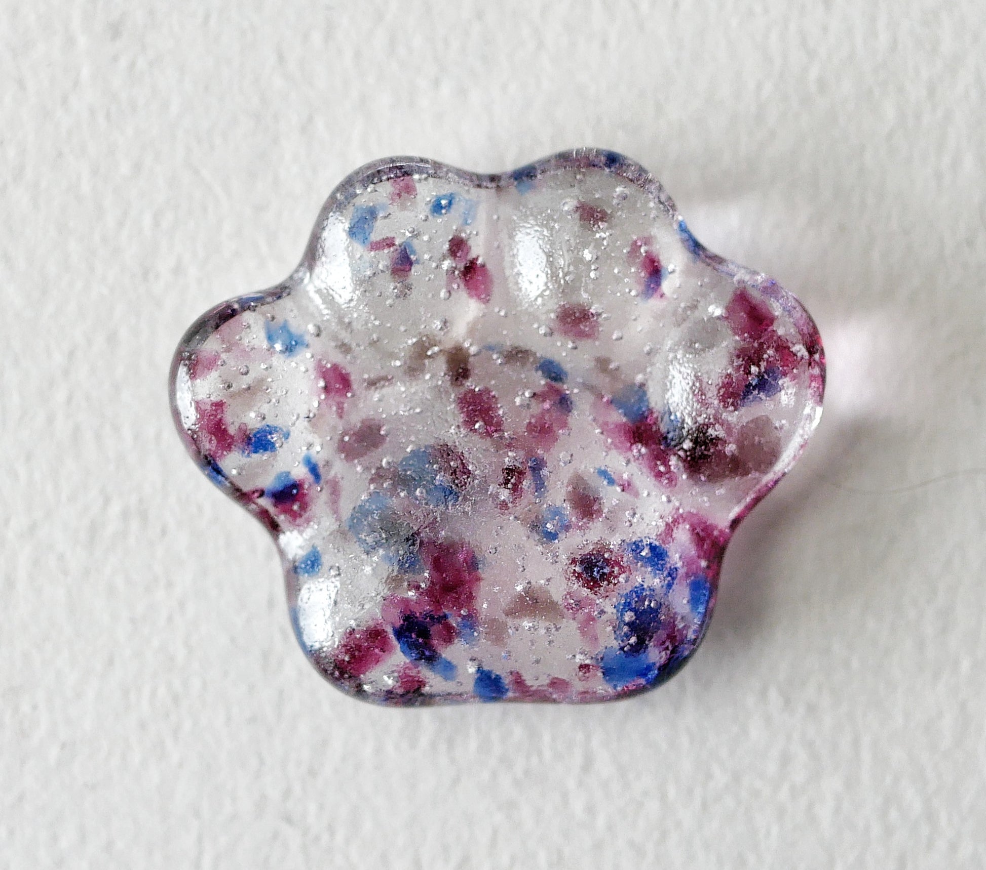 A piece of handmade fused glass in the shape of a paw, great as a gift to remind someone you love them. Made with a subtle nod to the lesbian sunset flag with the mottled five colors mixed with clear for a confetti effect.