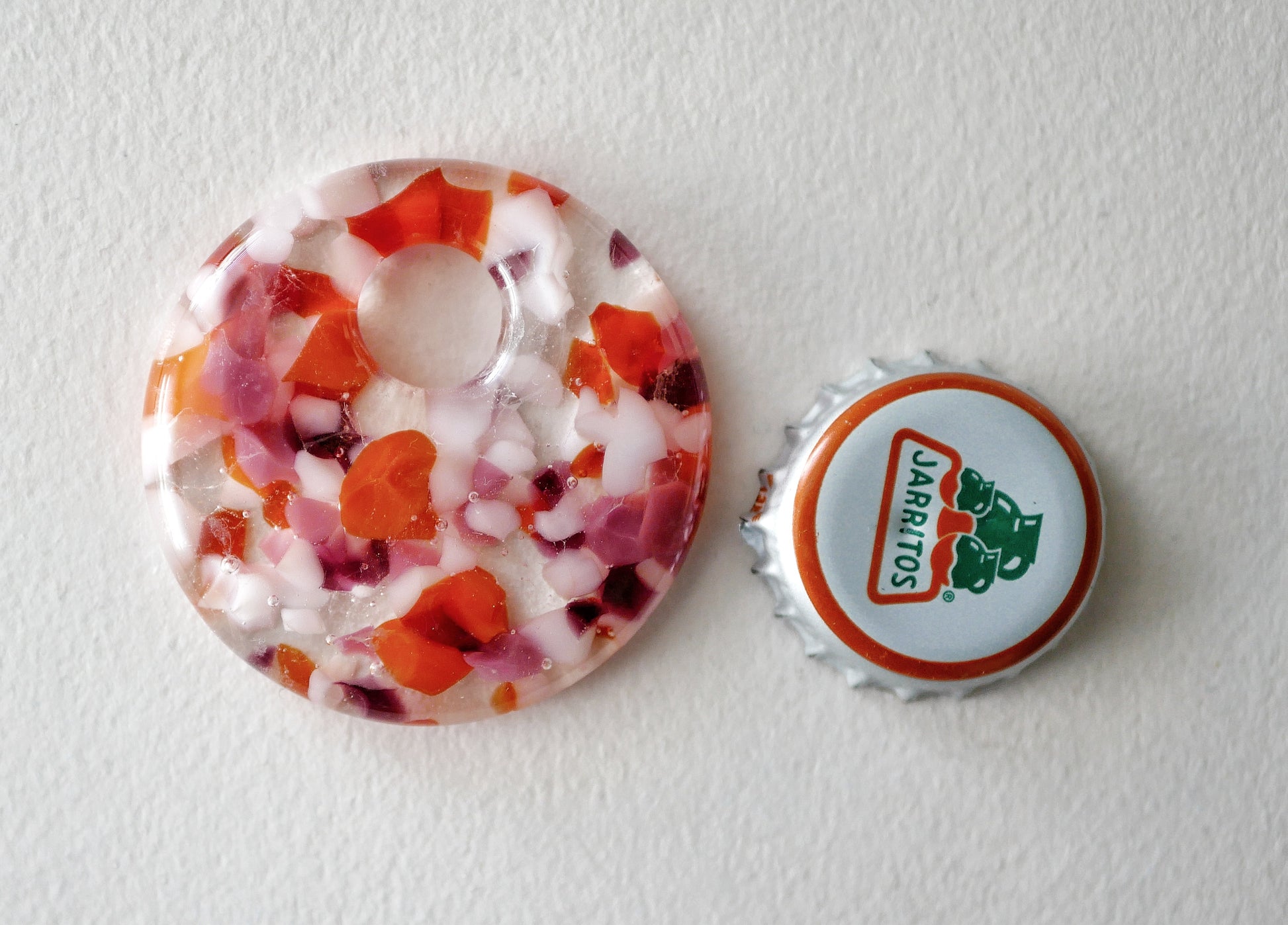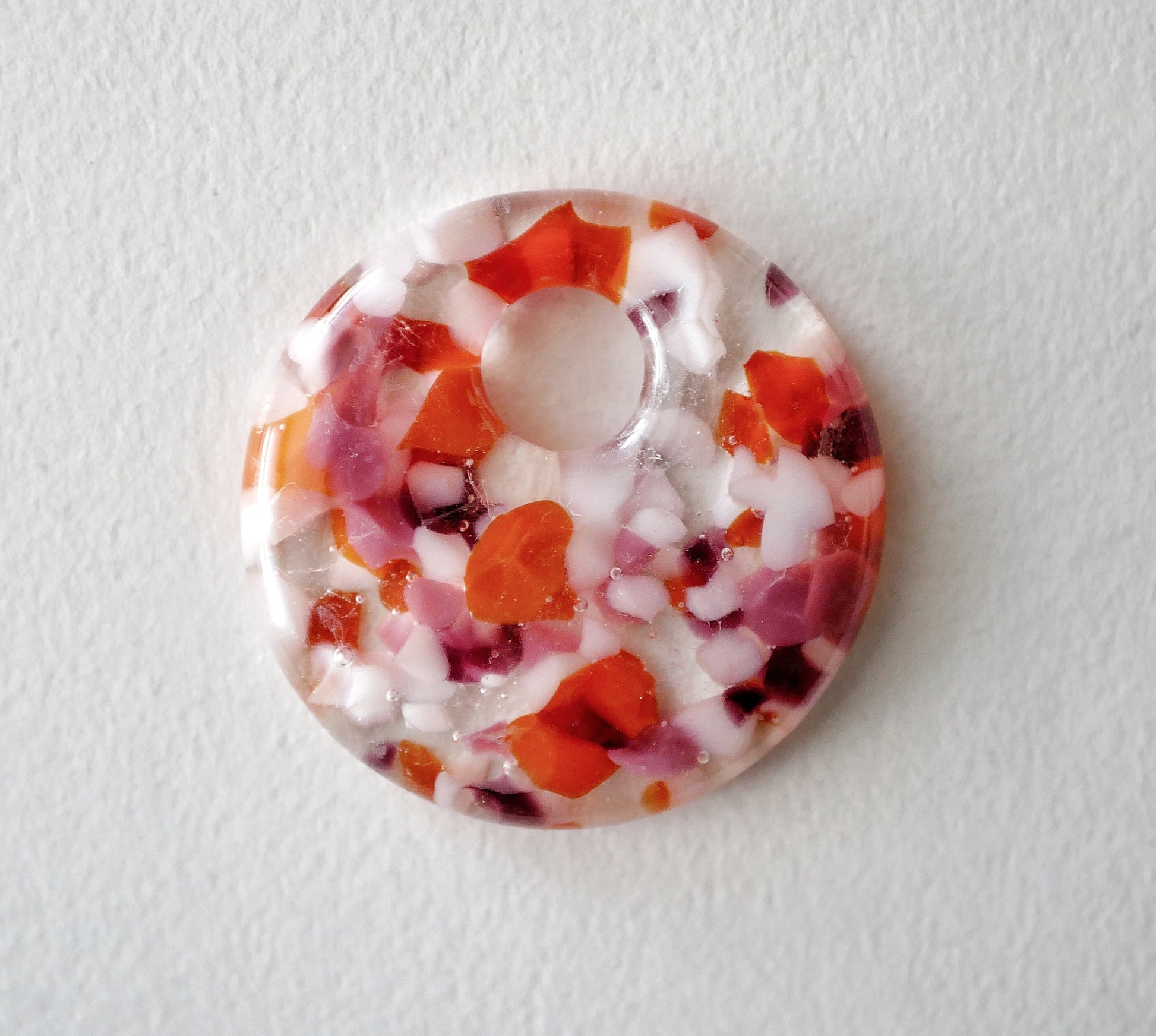 Handmade in my kiln by me with a subtle nod to the lesbian sunset flag with the mottled five colors mixed with clear for a petal effect. There's a few of these that have slightly different patterning, you may not receive the exact one in the picture.