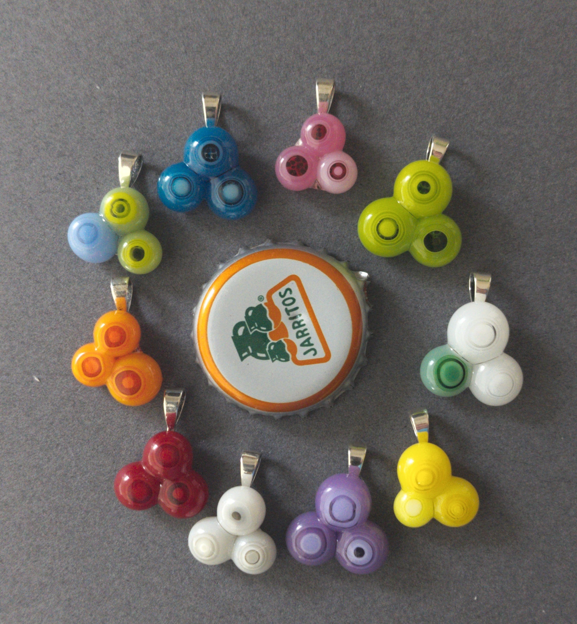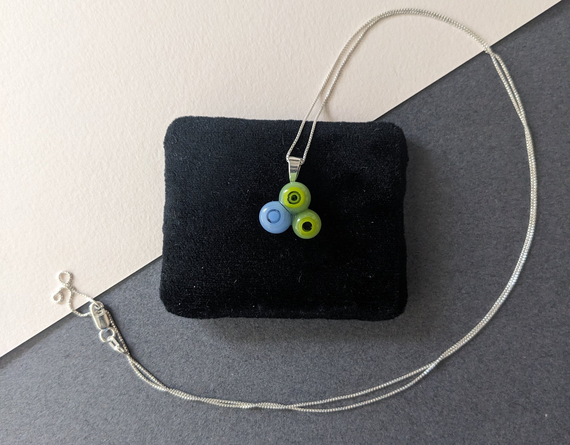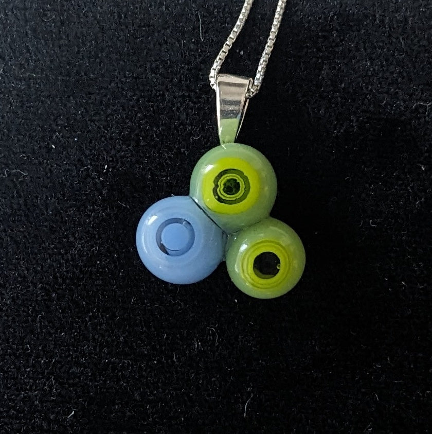 Handmade in my kiln by me! Small clusters of 3 blobs of murrine glass. Sterling silver bail and chain (24 inches).
