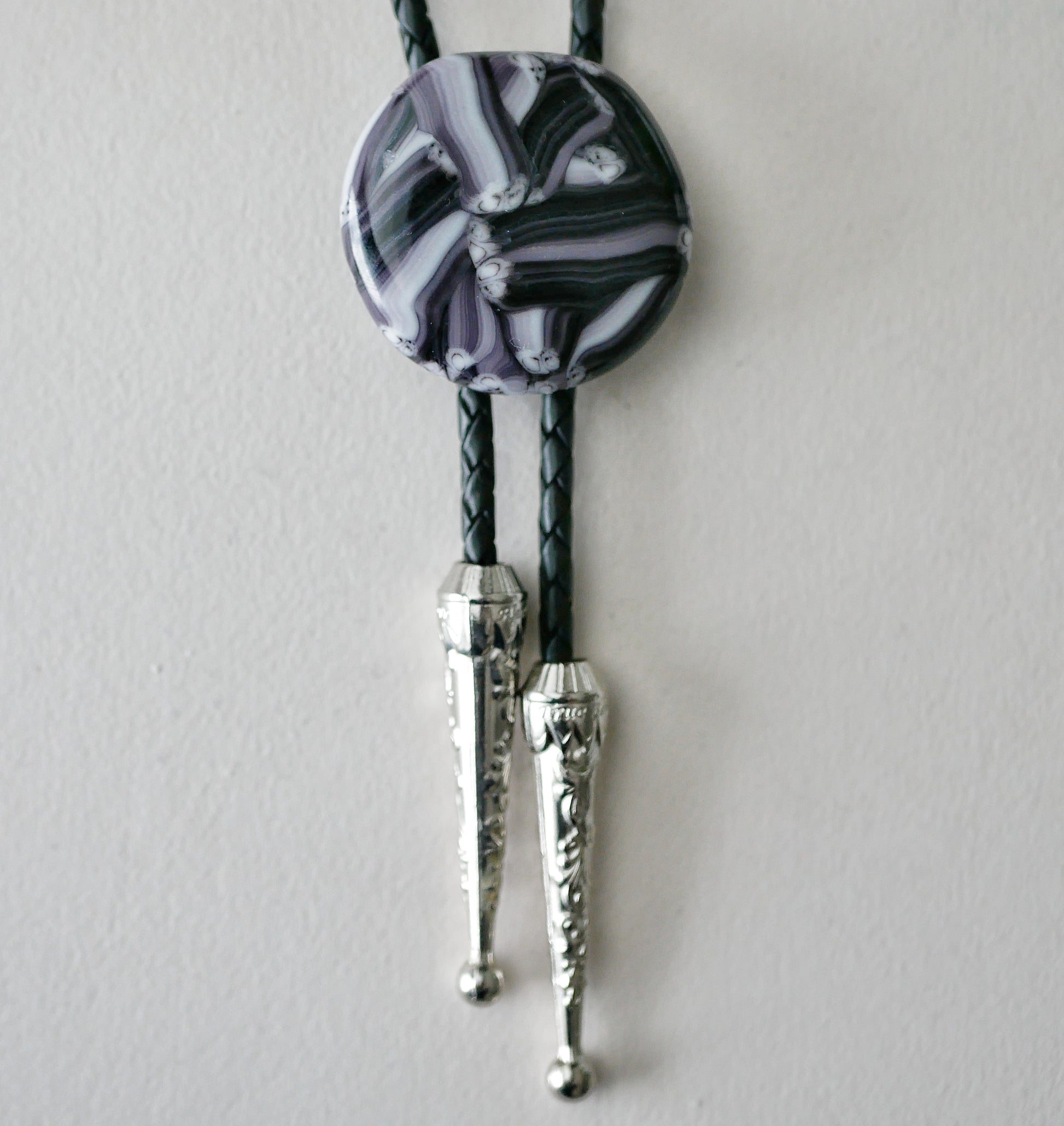 A fused glass cabochon on a 42 inch leather bolo tie with a flat back so it sits nicely under your collar. Base metal findings.