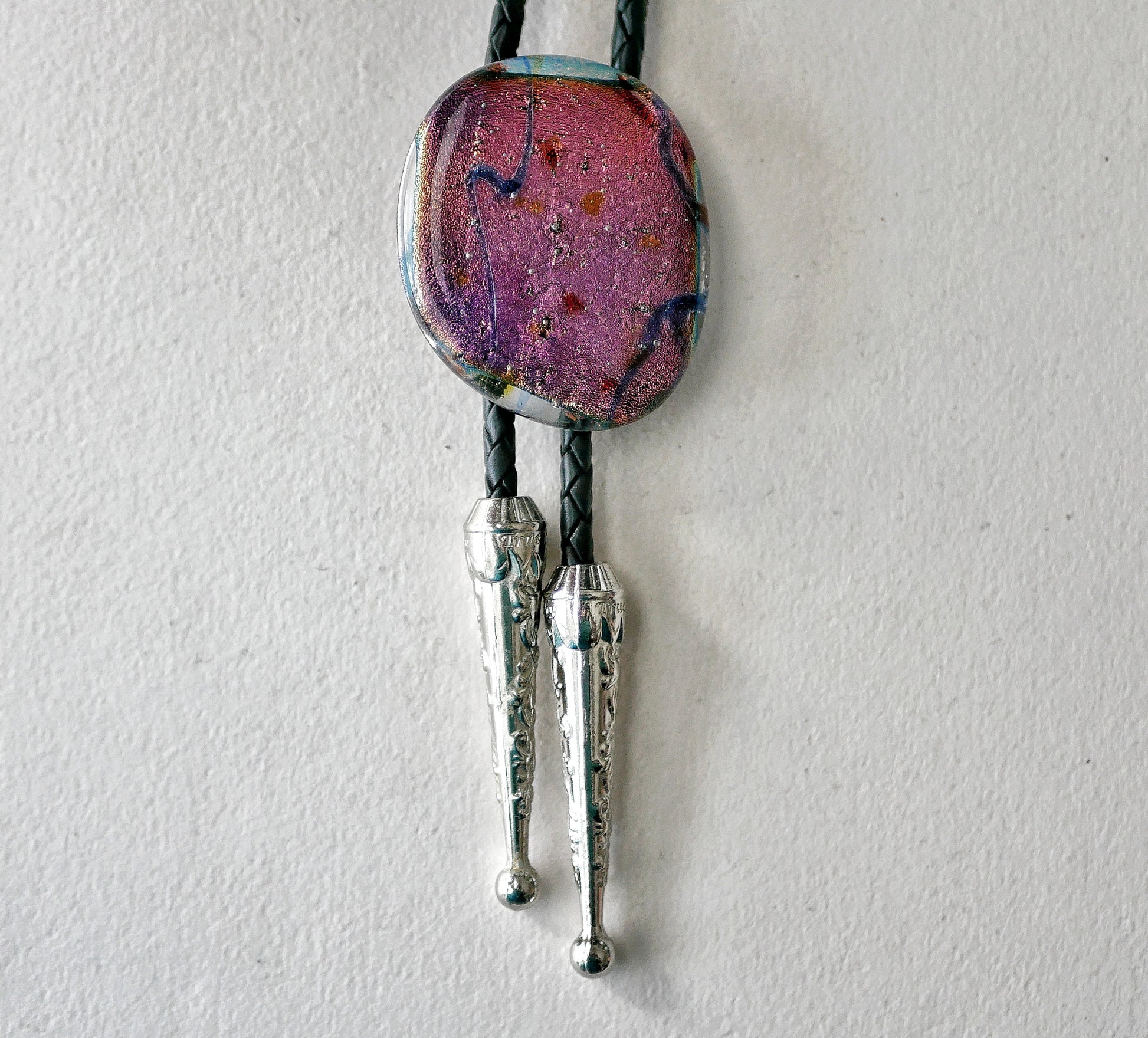 A fused glass cabochon on a 42 inch leather bolo tie with a flat back so it sits nicely under your collar. Base metal findings.