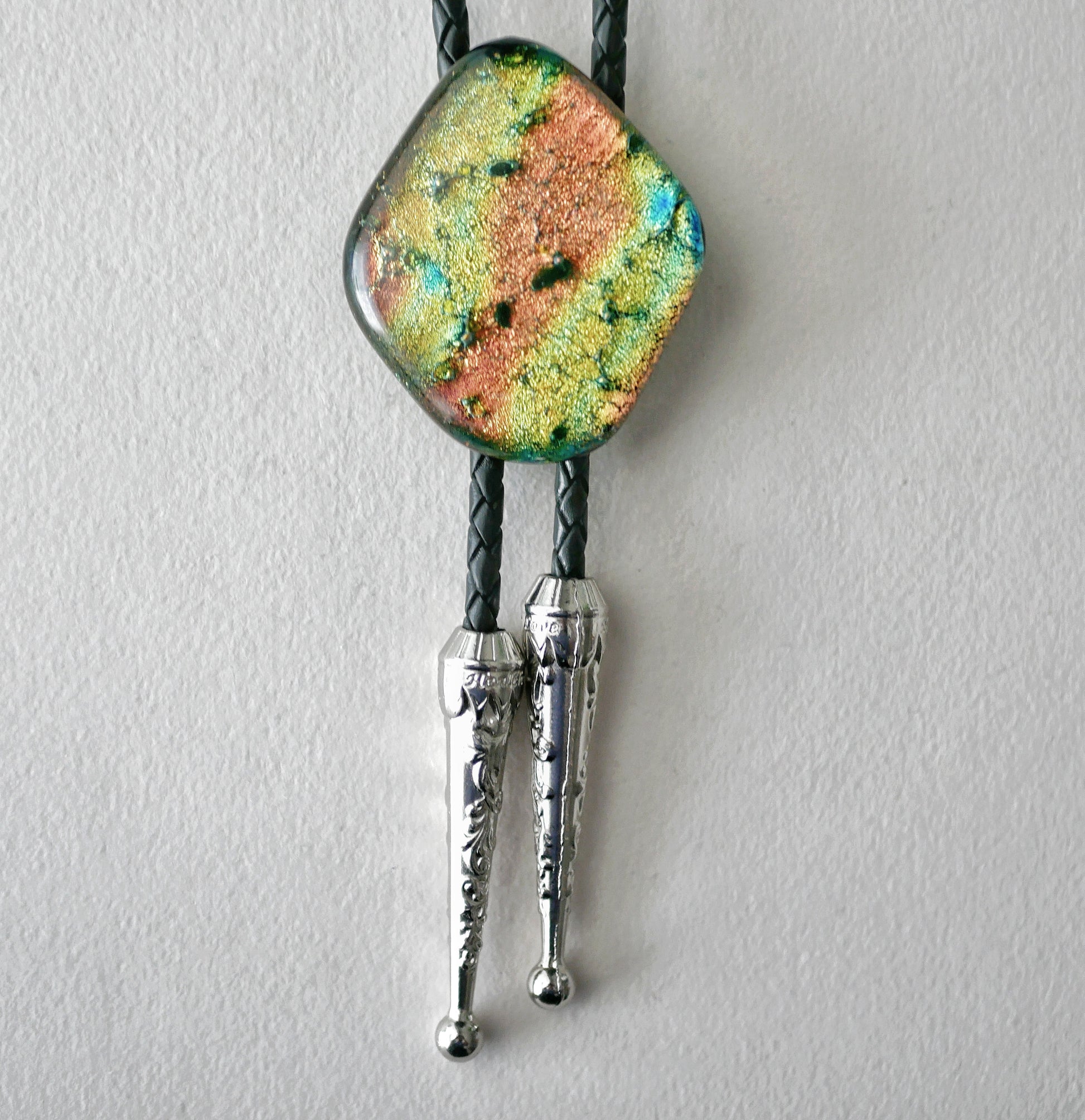 A fused glass cabochon on a 42 inch leather bolo tie with a flat back so it sits nicely under your collar. Base metal findings.