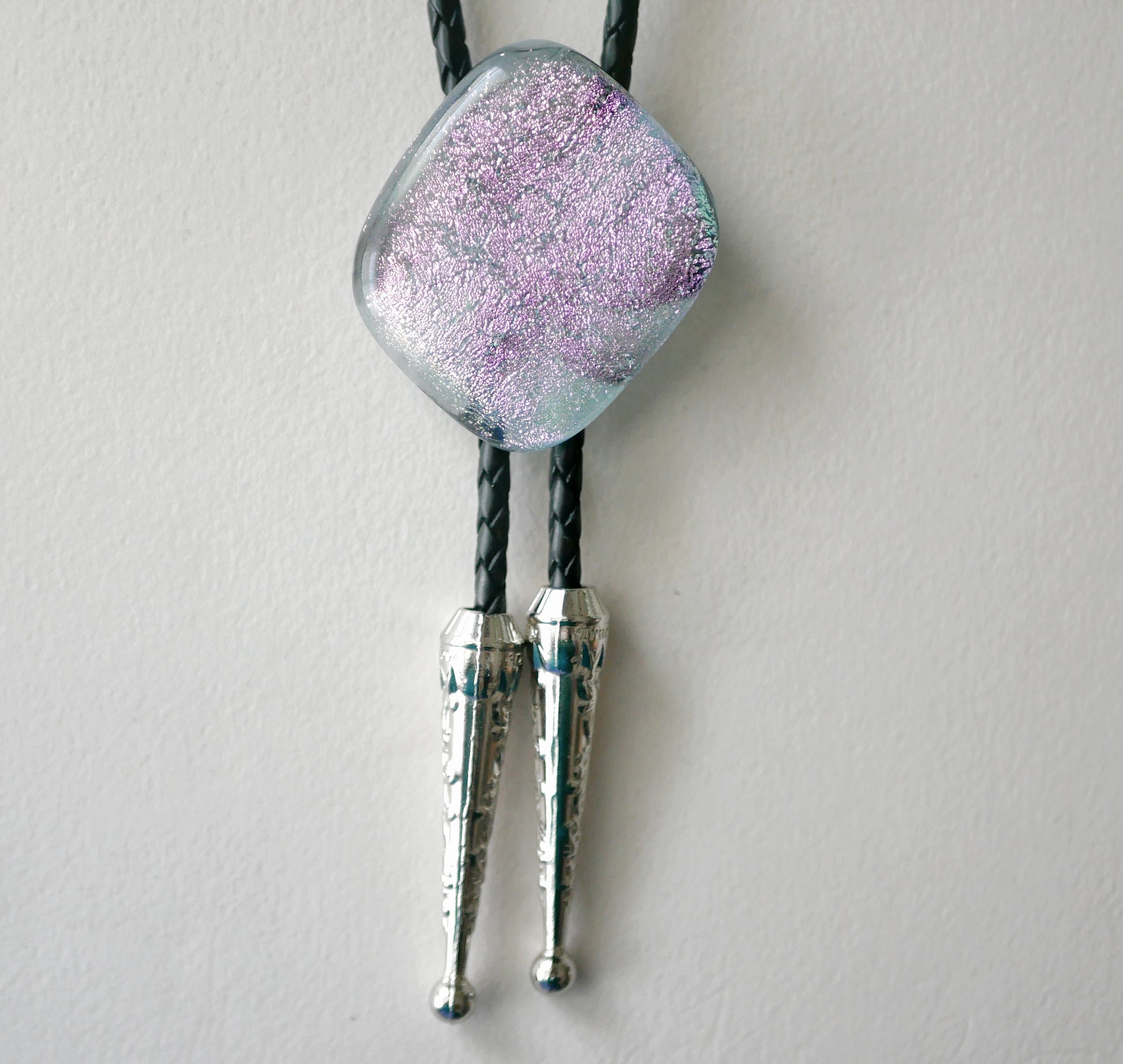 A fused glass cabochon on a 42 inch leather bolo tie with a flat back so it sits nicely under your collar. Base metal findings.