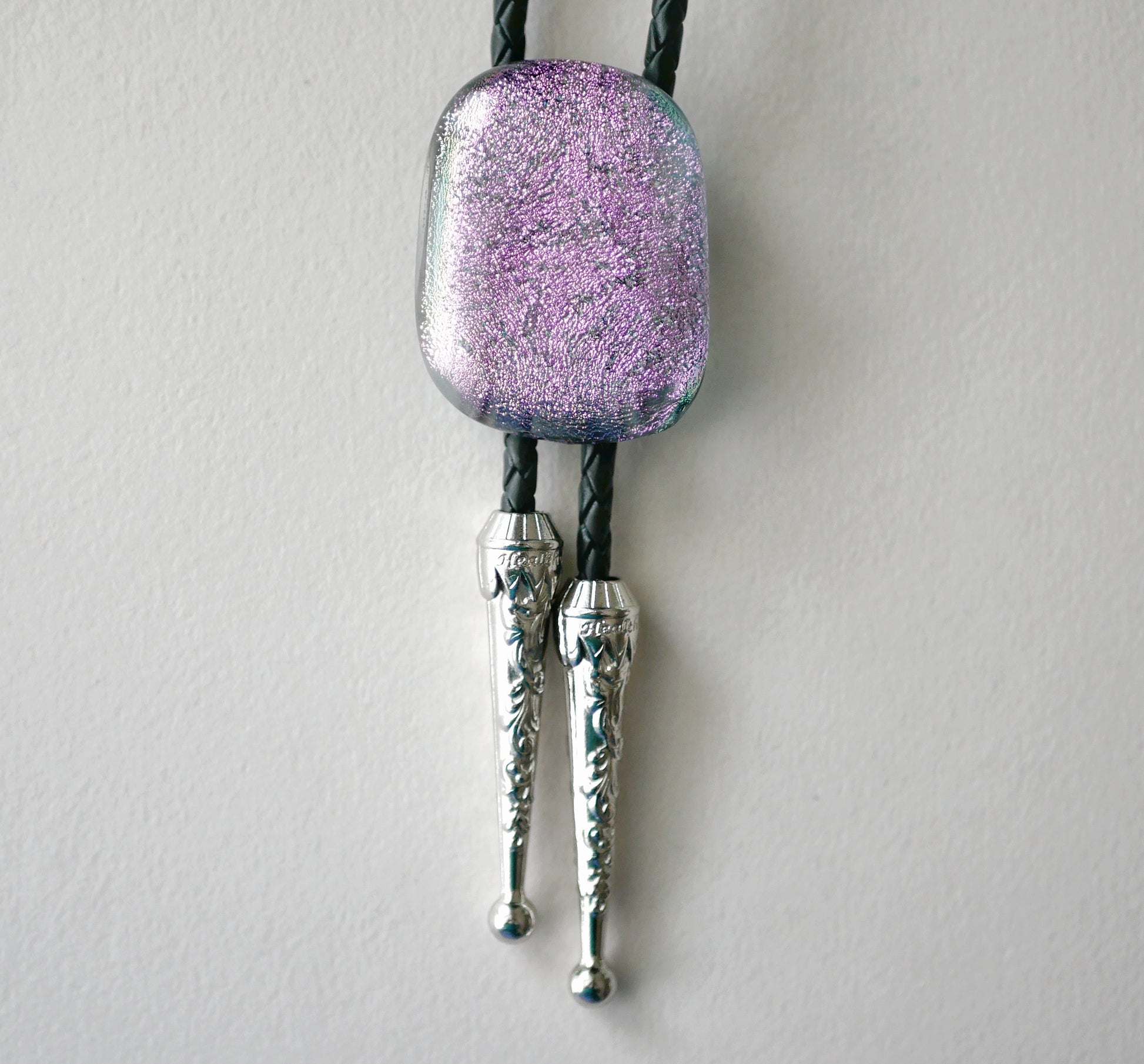 A fused glass cabochon on a 42 inch leather bolo tie with a flat back so it sits nicely under your collar. Base metal findings.