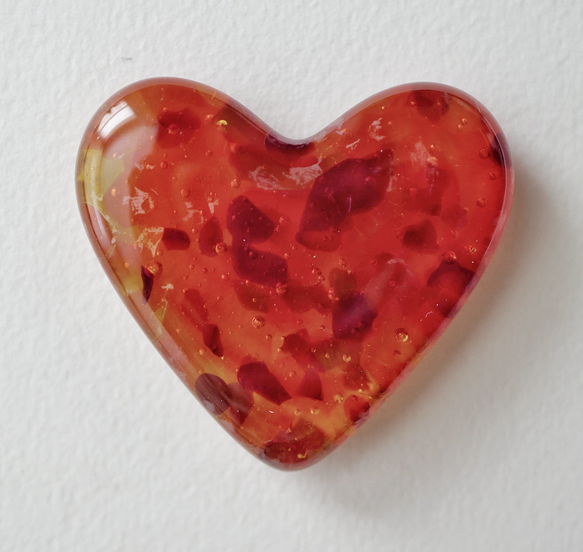 A piece of handmade fused glass in the shape of a heart, great as a gift to remind someone you love them.