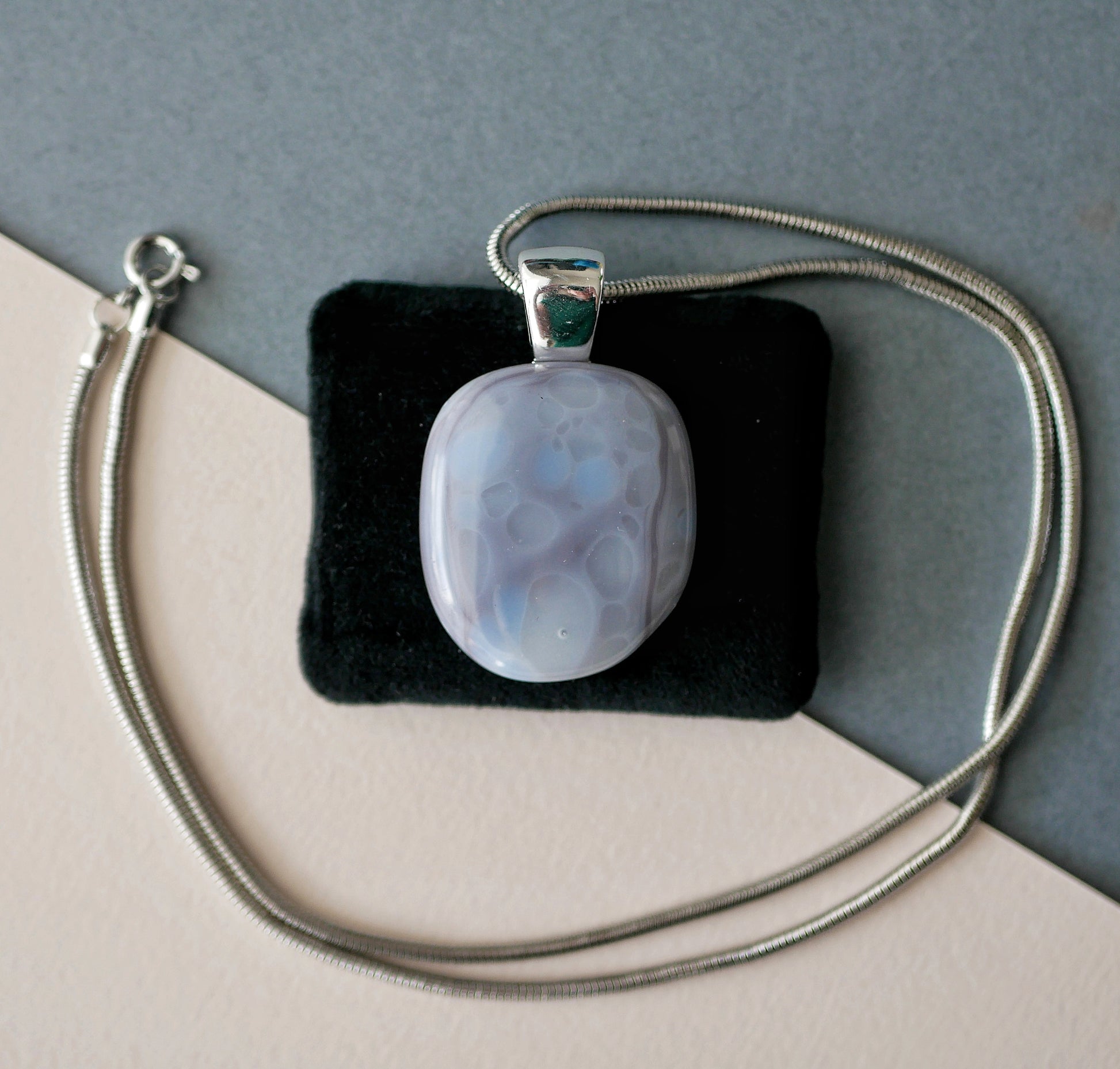 NOTE: This is a handmade glass item. That means it's a little bit fragile. I recommend not wearing it with other necklaces that can clink against it, avoiding dropping it, and don't take it suddenly from one temperature to another.