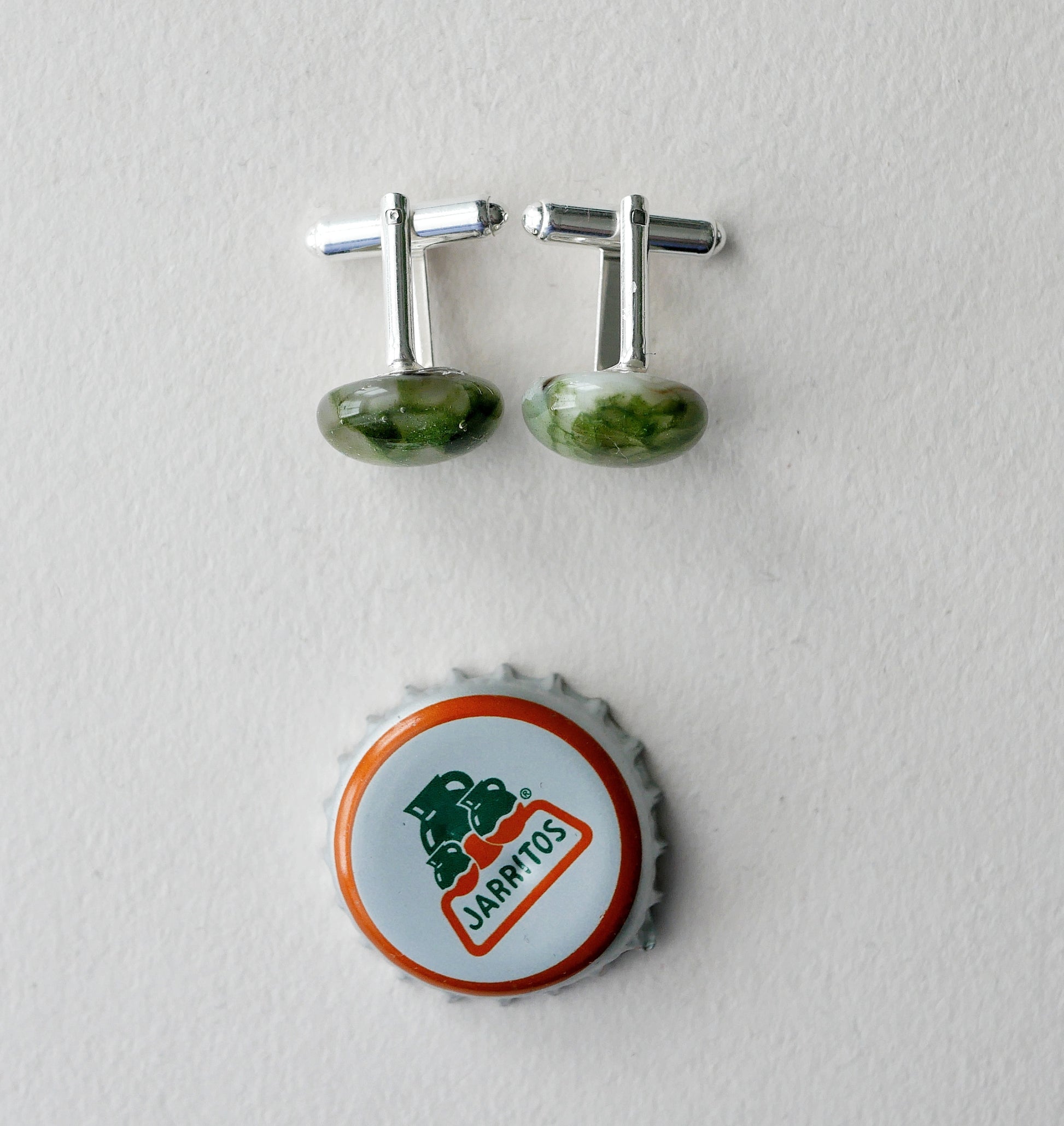 A pair of hinged sterling silver cufflinks with handmade fused glass.
