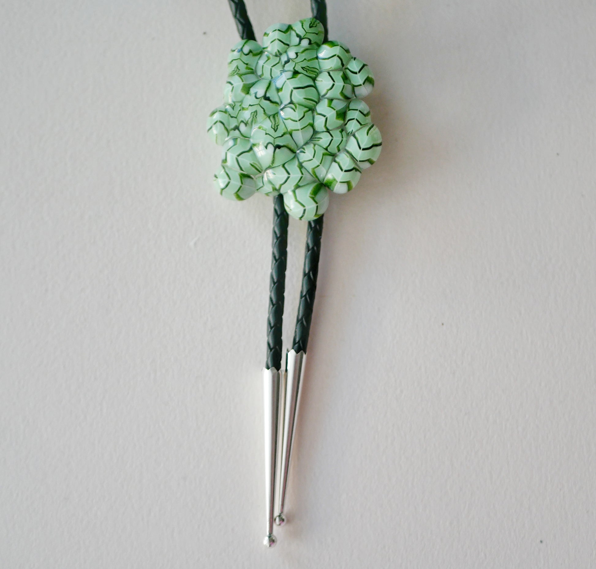A fused glass cabochon on a 42 inch leather bolo tie with a flat back so it sits nicely under your collar. Stainless steel slide and sterling silver tips.
