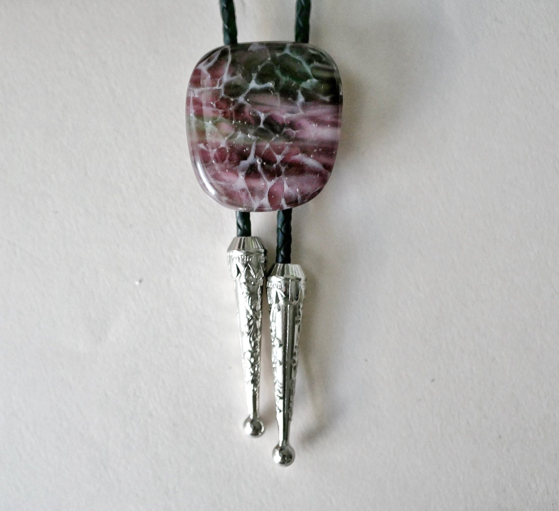 A fused glass cabochon on a 42 inch leather bolo tie with a flat back so it sits nicely under your collar. Base metal findings.