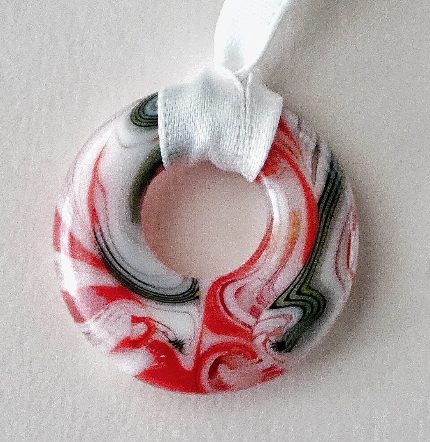 Handmade in my kiln by me! These work nicely as Christmas tree ornaments but also look good hanging on a wall or in a window. They come with a loop of ribbon for hanging.