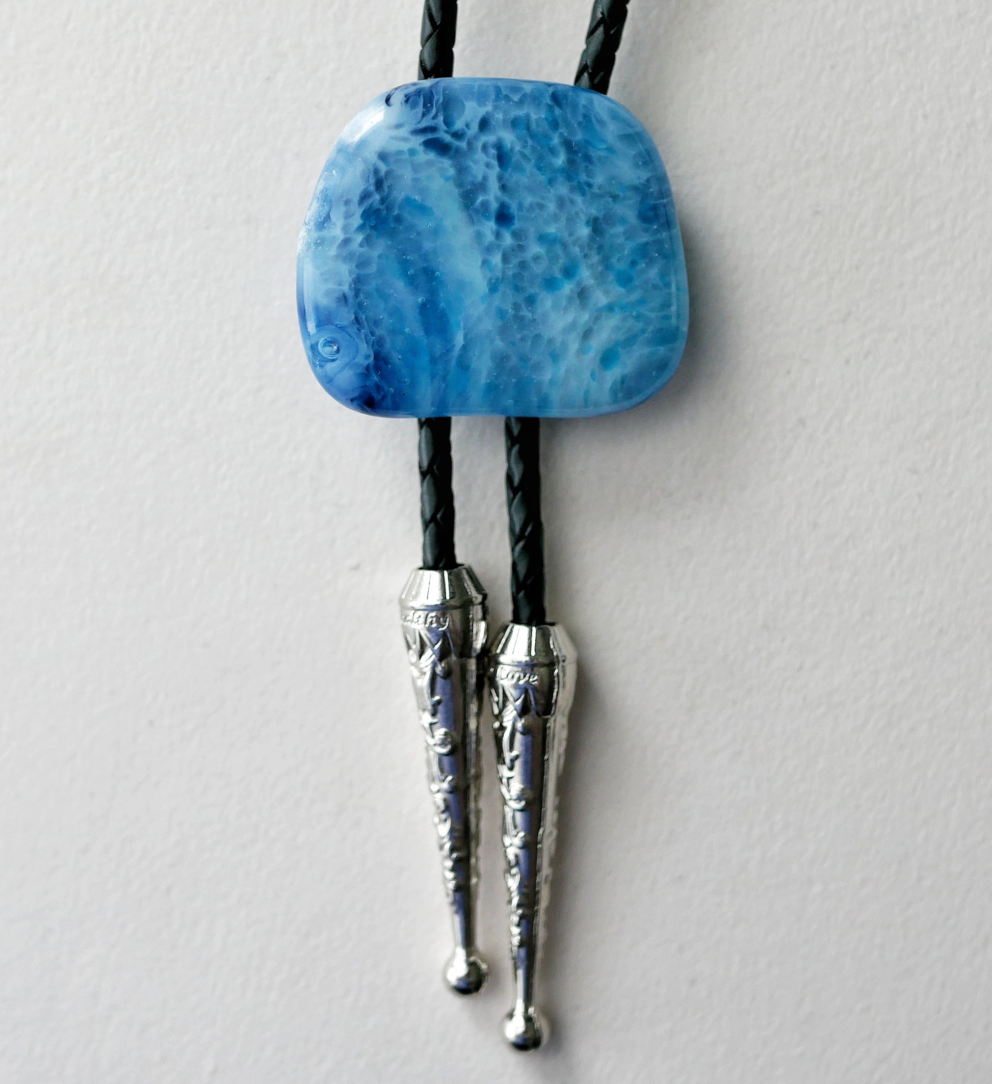 A fused glass cabochon on a 42 inch leather bolo tie with a flat back so it sits nicely under your collar. Base metal findings.