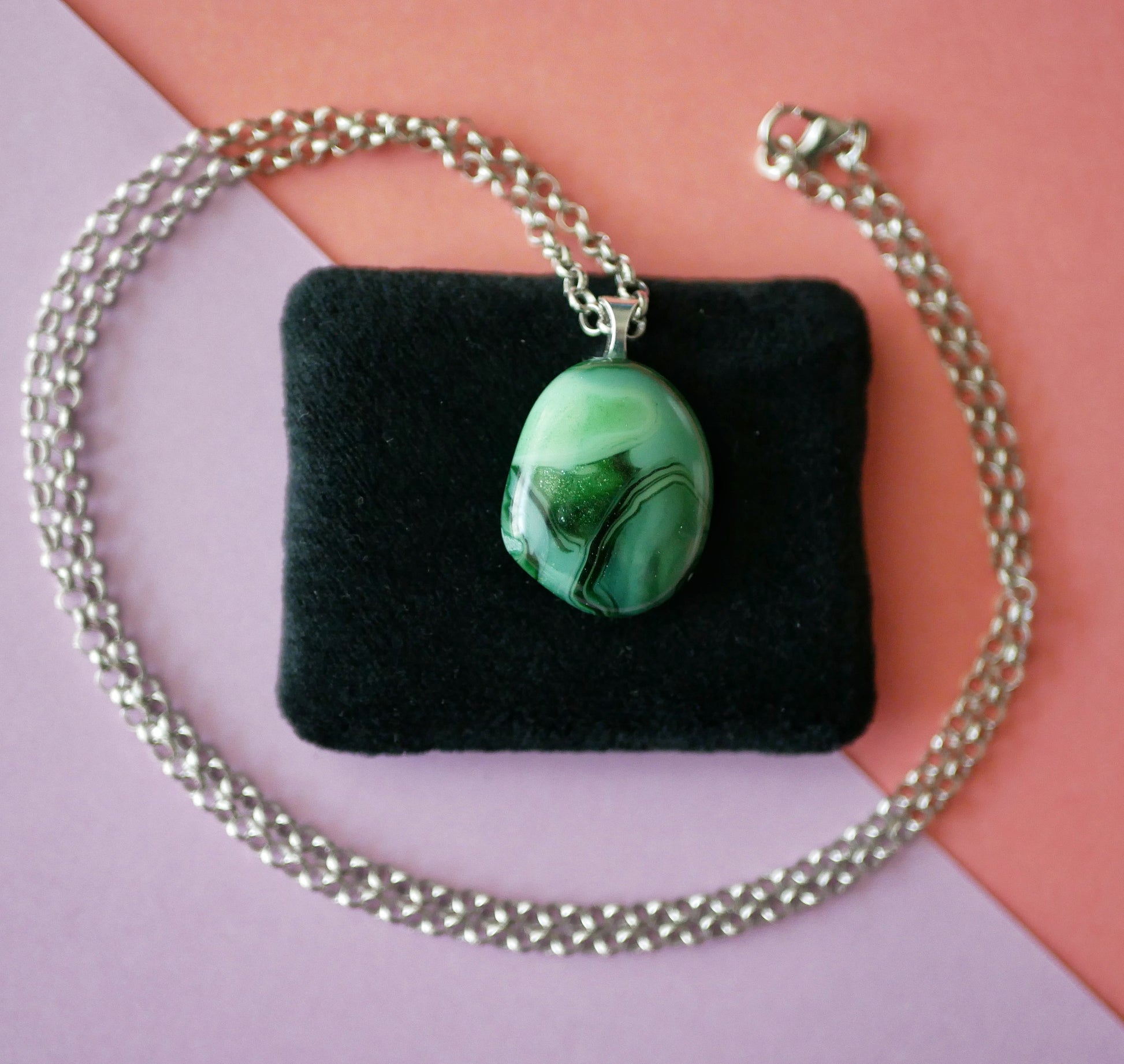 NOTE: This is a handmade glass item. That means it's a little bit fragile. I recommend not wearing it with other necklaces that can clink against it, avoiding dropping it, and don't take it suddenly from one temperature to another.