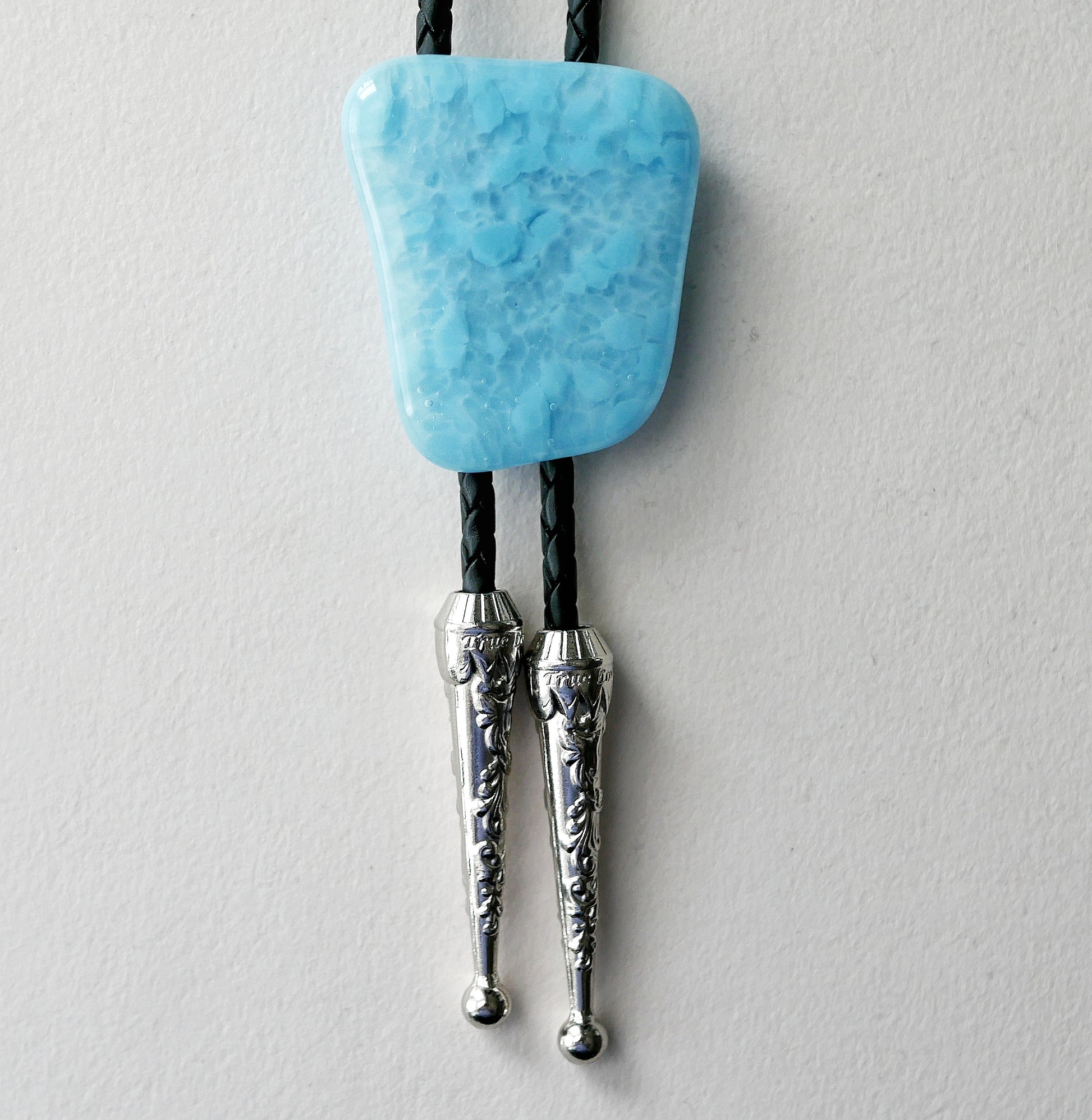 A fused glass cabochon on a 42 inch leather bolo tie with a flat back so it sits nicely under your collar. Base metal findings.