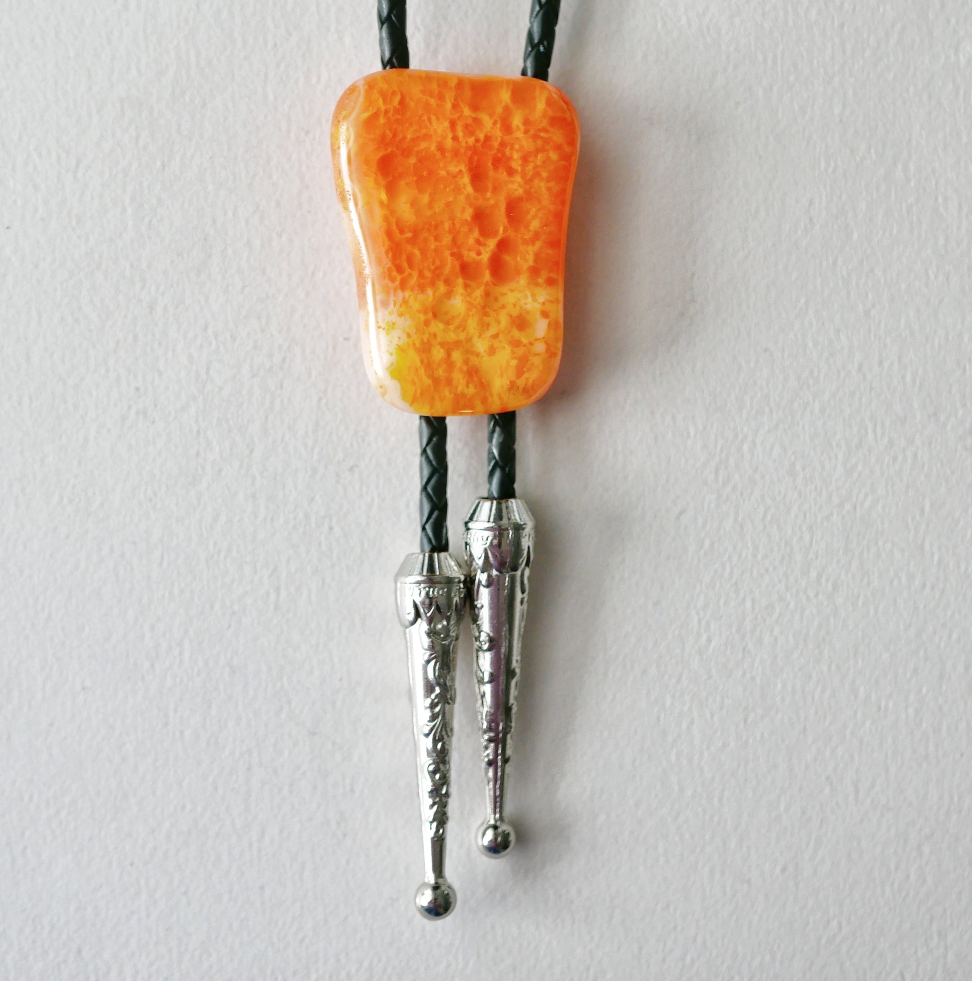 A fused glass cabochon on a 42 inch leather bolo tie with a flat back so it sits nicely under your collar. Base metal findings.