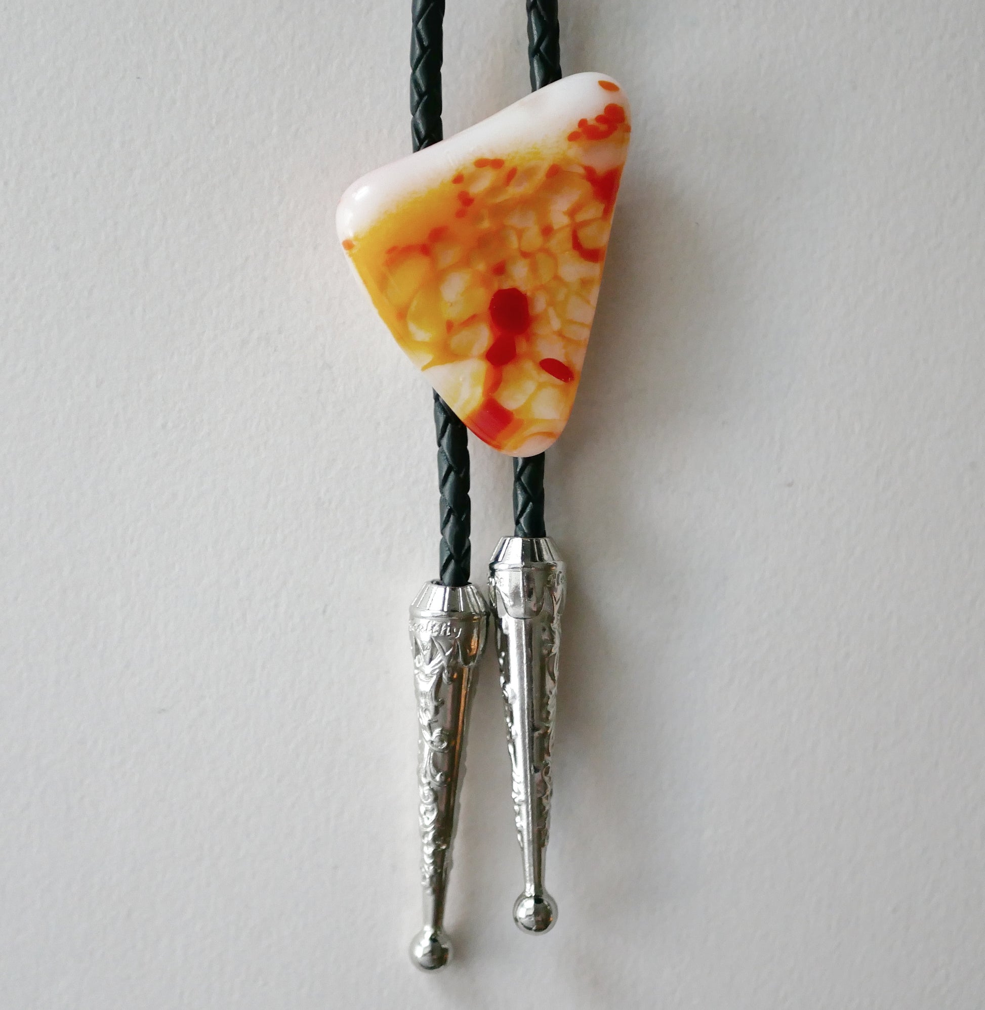 A fused glass cabochon on a 42 inch leather bolo tie with a flat back so it sits nicely under your collar. Base metal findings.