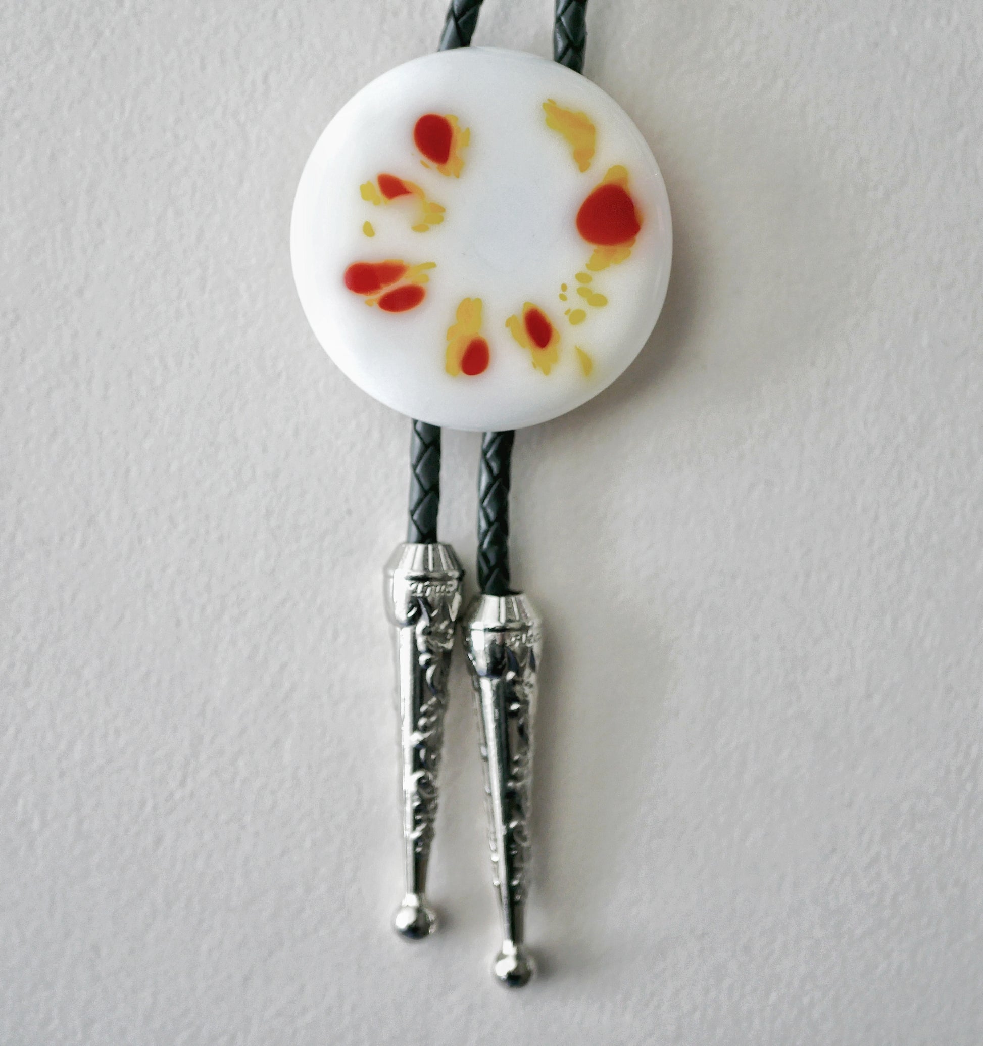 A fused glass cabochon on a 42 inch leather bolo tie with a flat back so it sits nicely under your collar. Base metal findings.