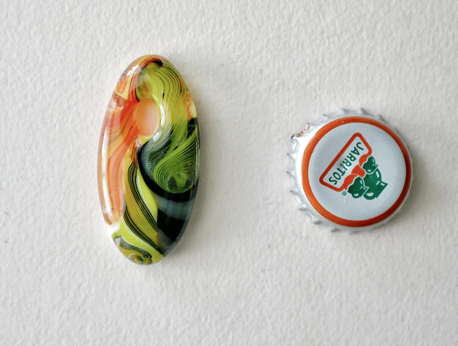 Handmade in my kiln by me! The swirling colors in these come from twisted glass cane that has been cut up and remelted.
