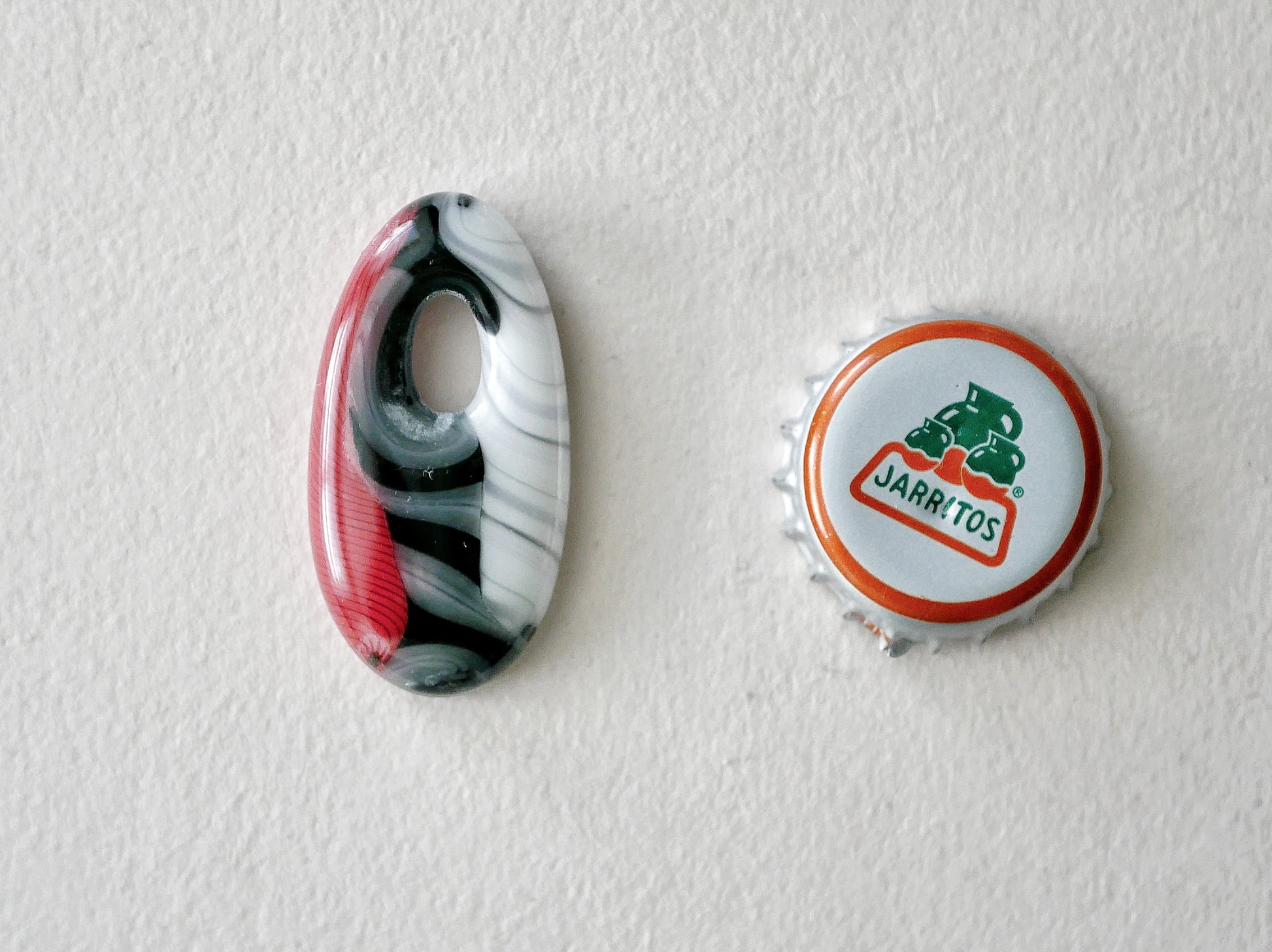 Handmade in my kiln by me! The swirling colors in these come from twisted glass cane that has been cut up and remelted.