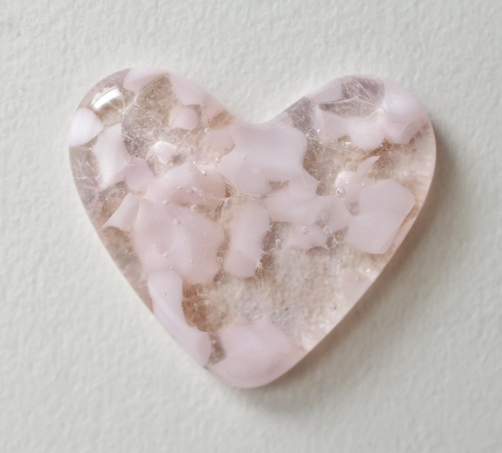 A piece of handmade fused glass in the shape of a heart, great as a gift to remind someone you love them.