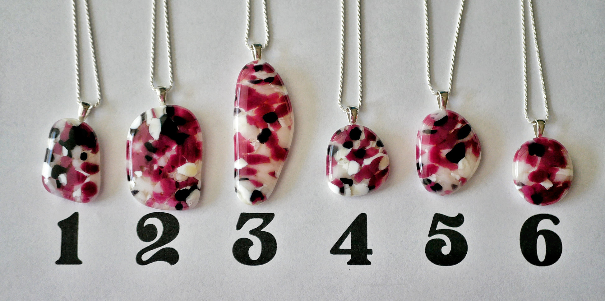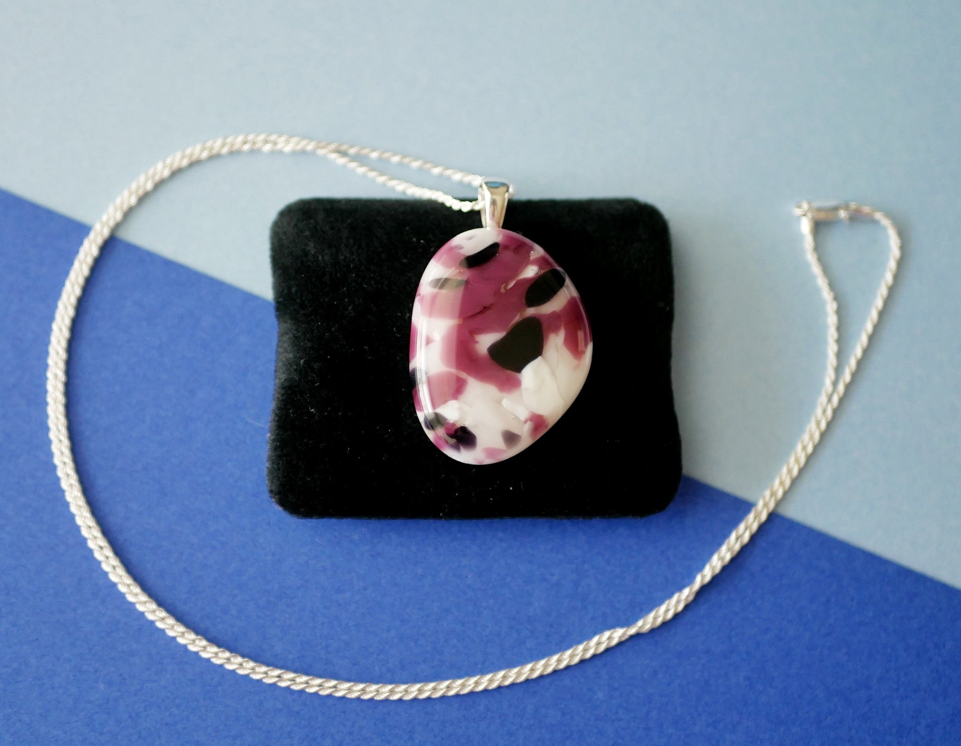 Handmade in my kiln by me! A speckled pendant in white, cream, pink and a purple so dark it's almost black.