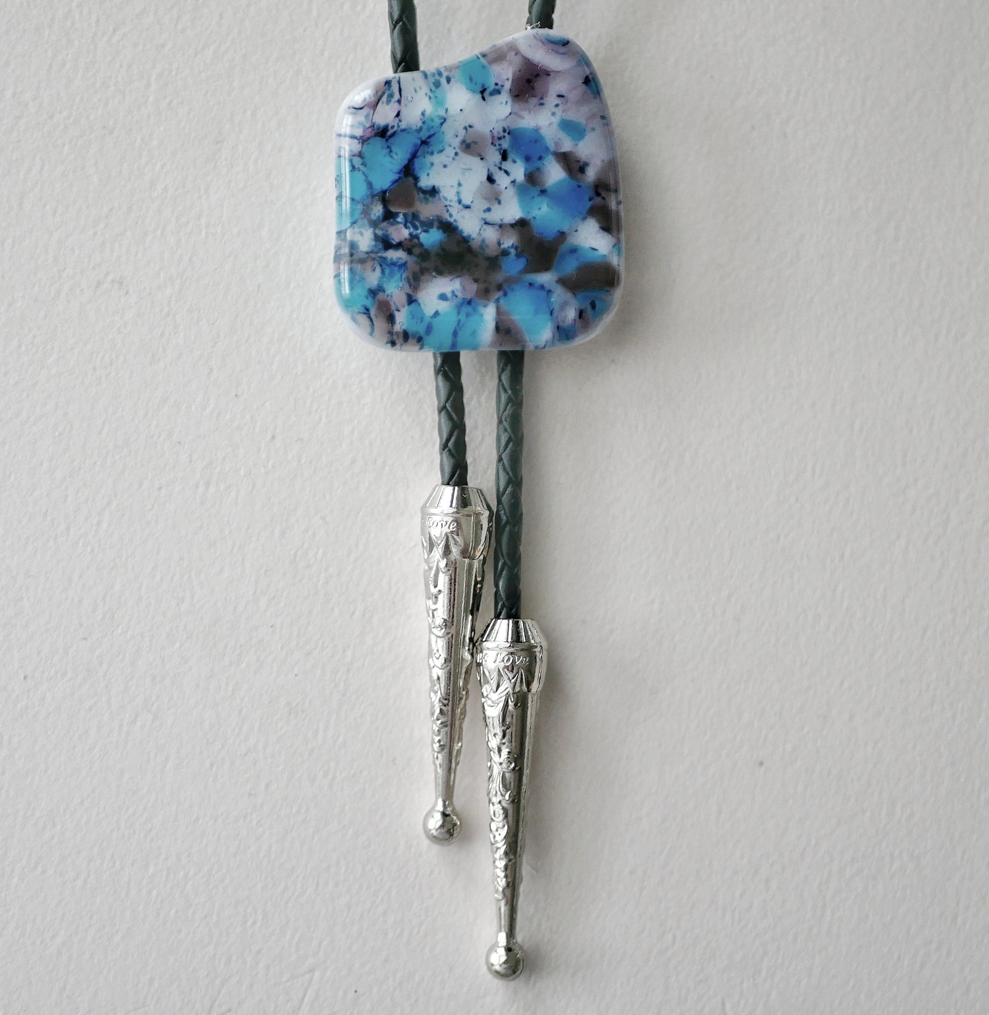 A fused glass cabochon on a 42 inch leather bolo tie with a flat back so it sits nicely under your collar. Base metal findings.