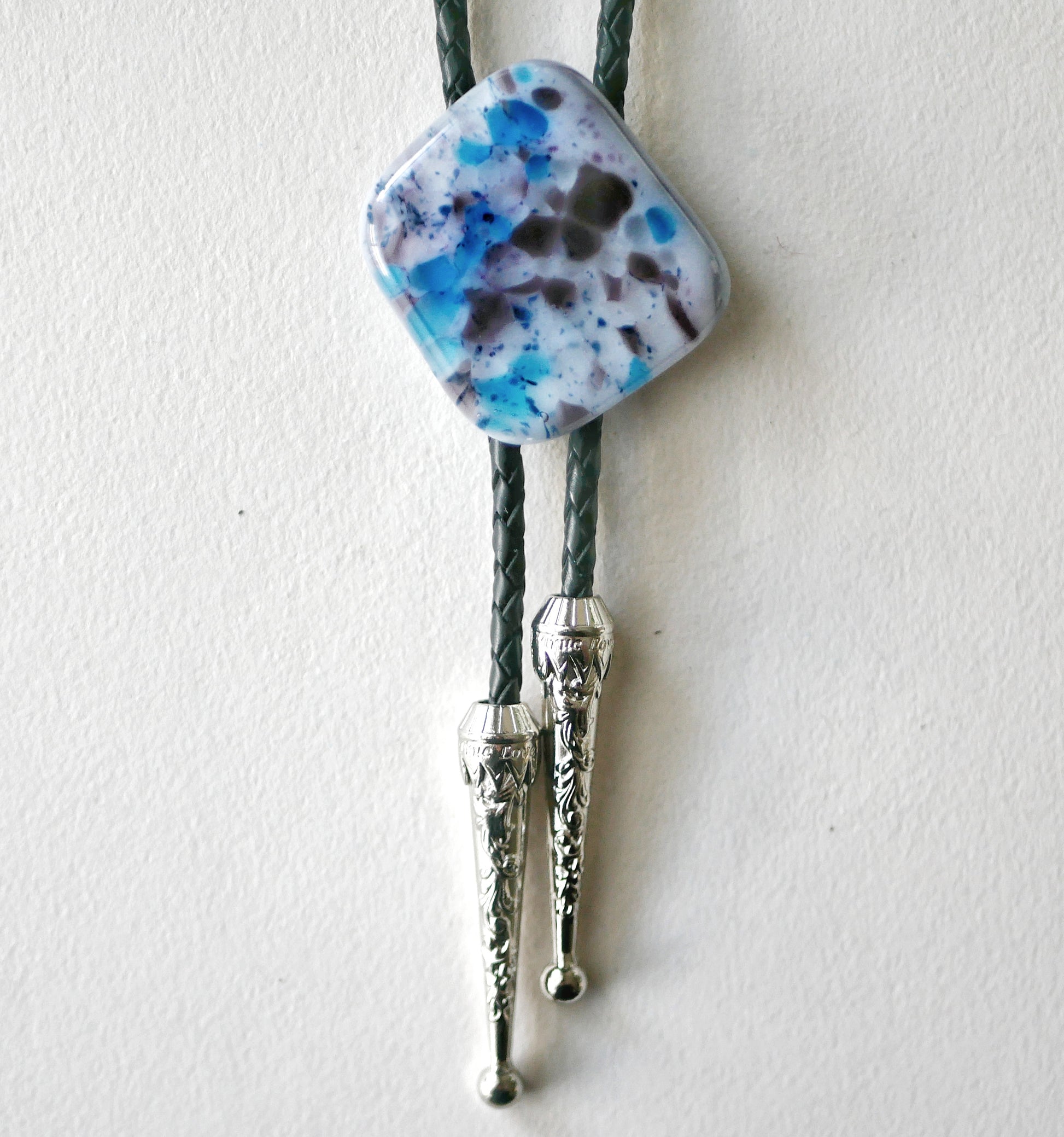A fused glass cabochon on a 42 inch leather bolo tie with a flat back so it sits nicely under your collar. Base metal findings.
