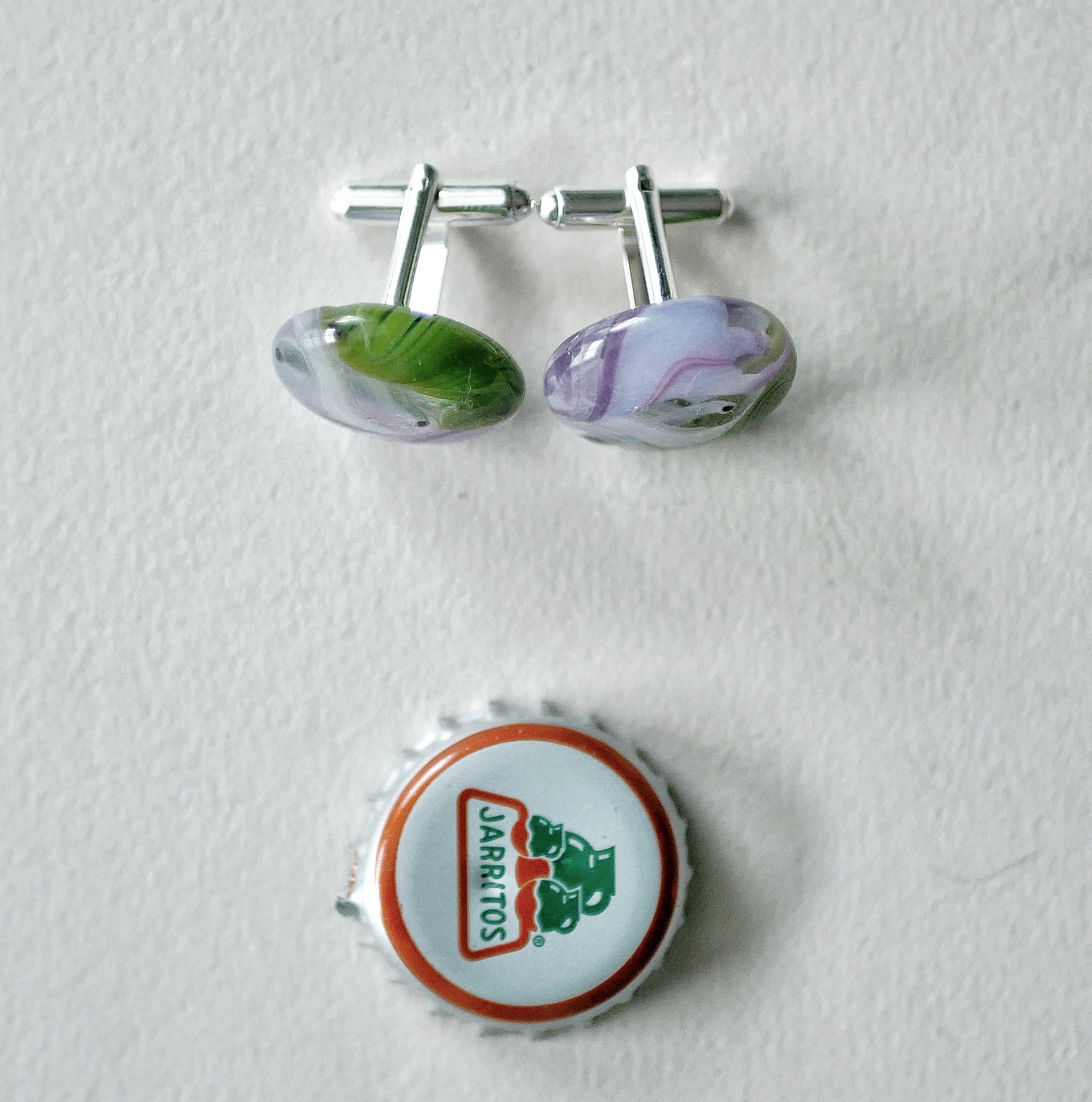 A pair of hinged sterling silver cufflinks with handmade fused glass.