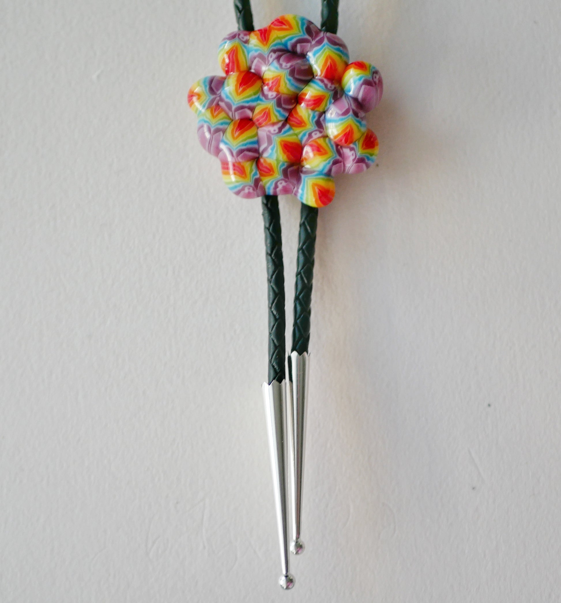A fused glass cabochon on a 42 inch leather bolo tie with a flat back so it sits nicely under your collar. Stainless steel slide and sterling silver tips.