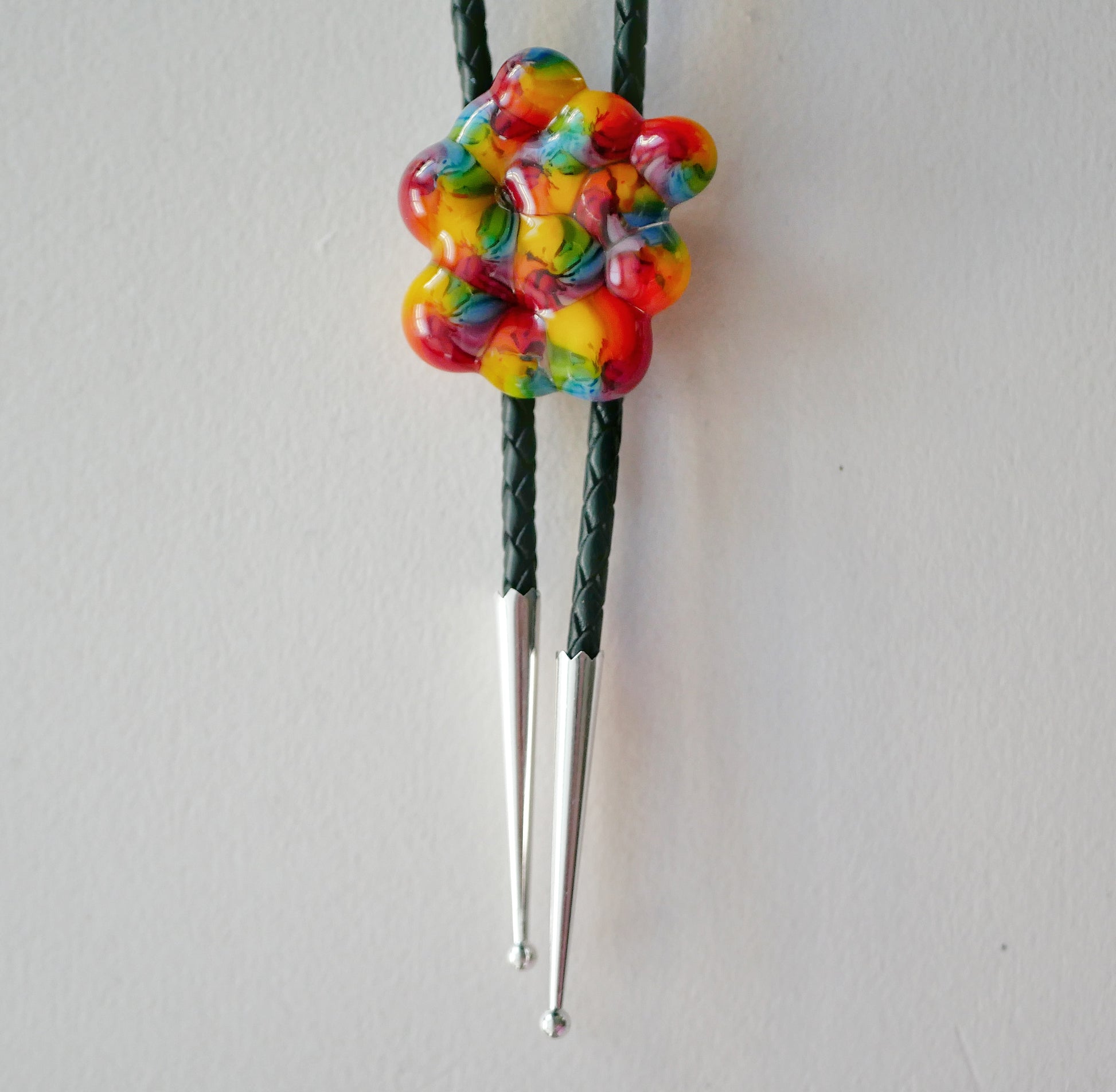 A fused glass cabochon on a 42 inch leather bolo tie with a flat back so it sits nicely under your collar. Stainless steel slide and sterling silver tips.