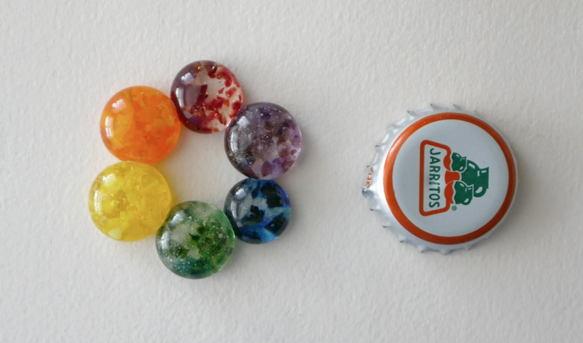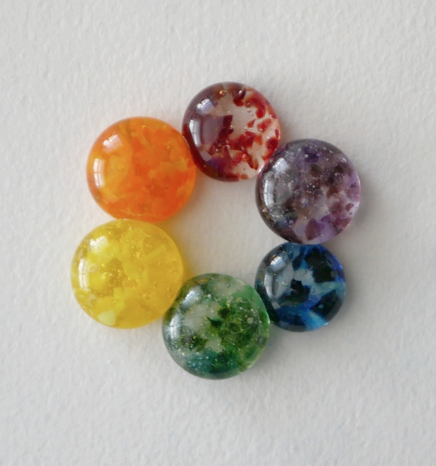 Handmade in my kiln by me! A circle made of 6 different color cabochons fused together. I recommend either a fine chain or a cord for this one; I have them in sterling silver as well as base metal.