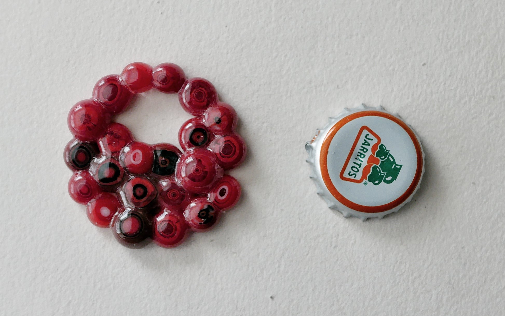 Handmade in my kiln by me! This one uses murrine cane that has been rounded but not fully melted, making the final piece bumpy. Because of this it has thinner parts and the joinings are a little bit less sturdy; you're going to want to be extra careful with it.