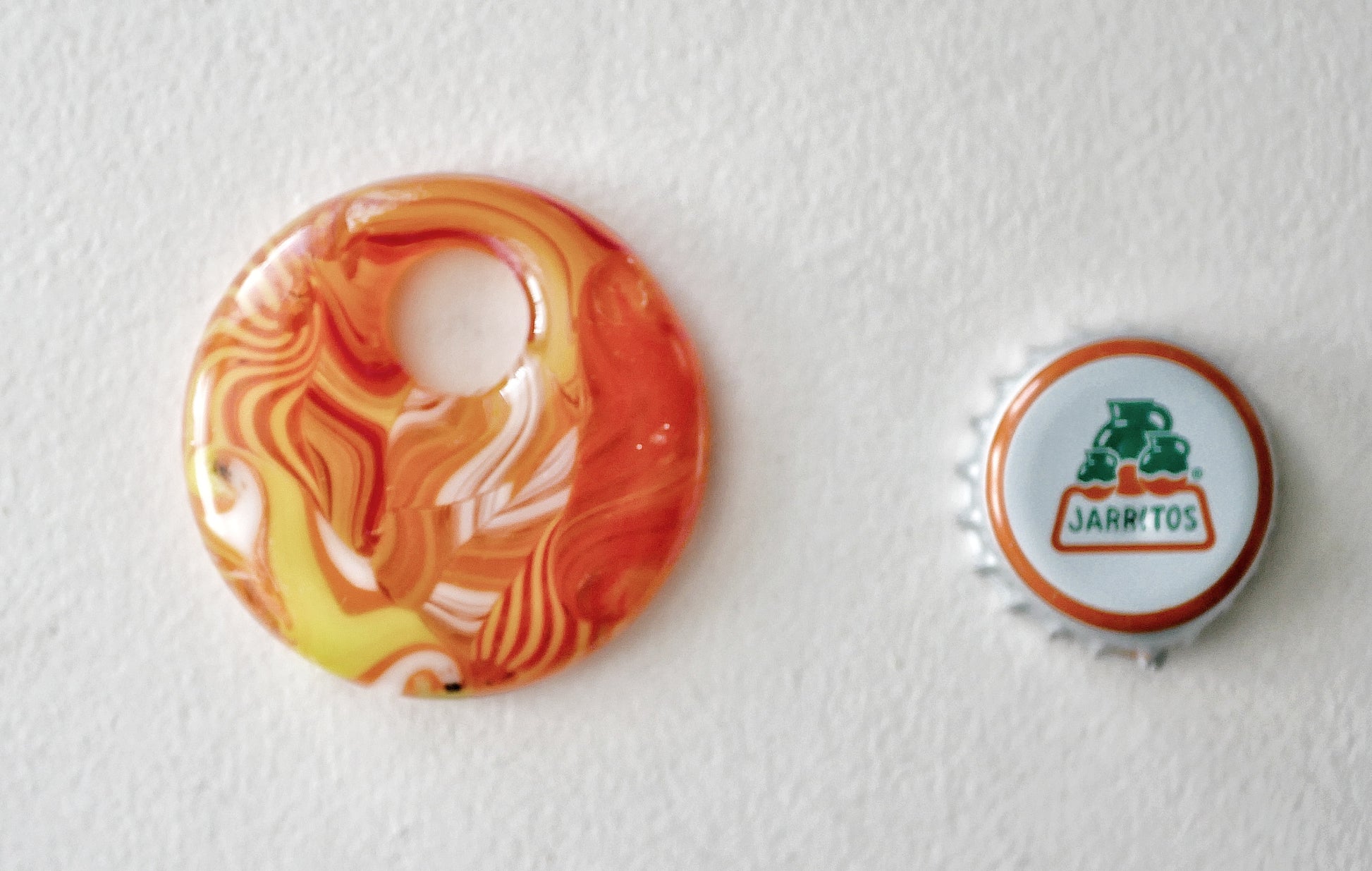 Handmade in my kiln by me! The swirling colors in these come from twisted glass cane that has been cut up and remelted.