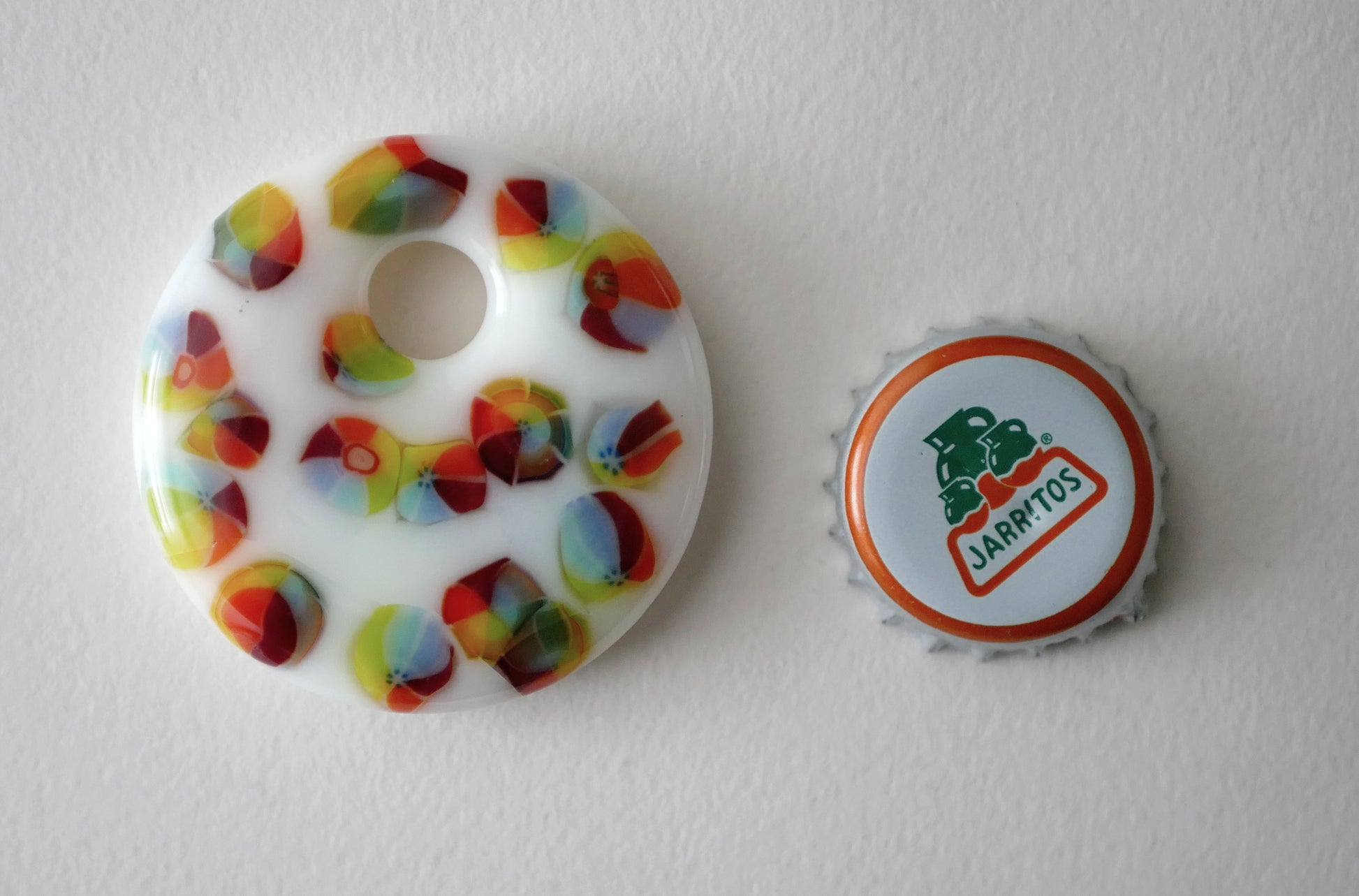 Handmade in my kiln by me! There are a few of these with slightly different patterning, you might not receive the exact one from the picture.