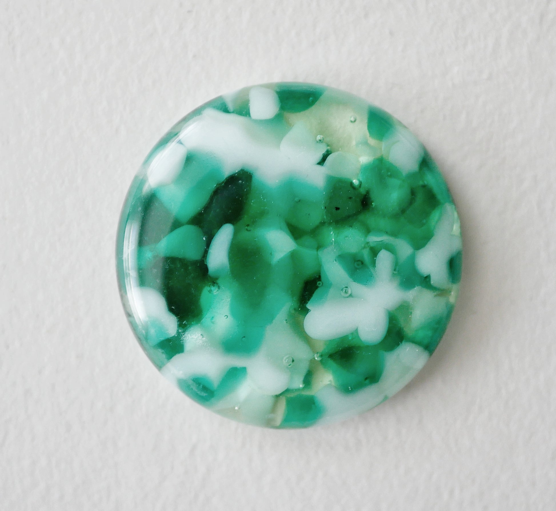 A piece of handmade fused glass in the shape of a circle, great as a gift to remind someone you love them. My worry stones have a smooth glass top and a slightly textured bottom from the ceramic molds they were made in. They also have just a slight indentation in the bottom. They feel good in your hand.