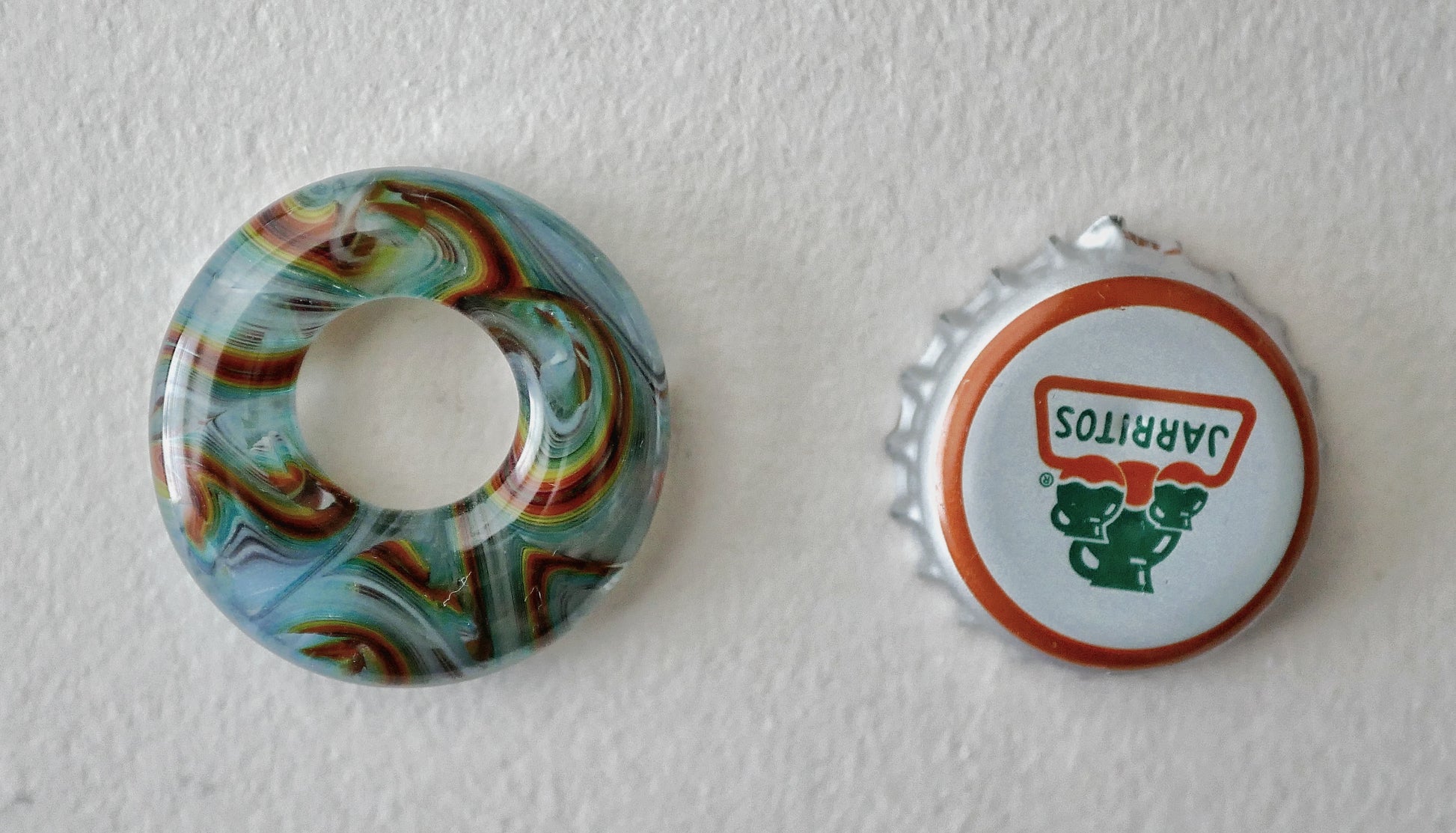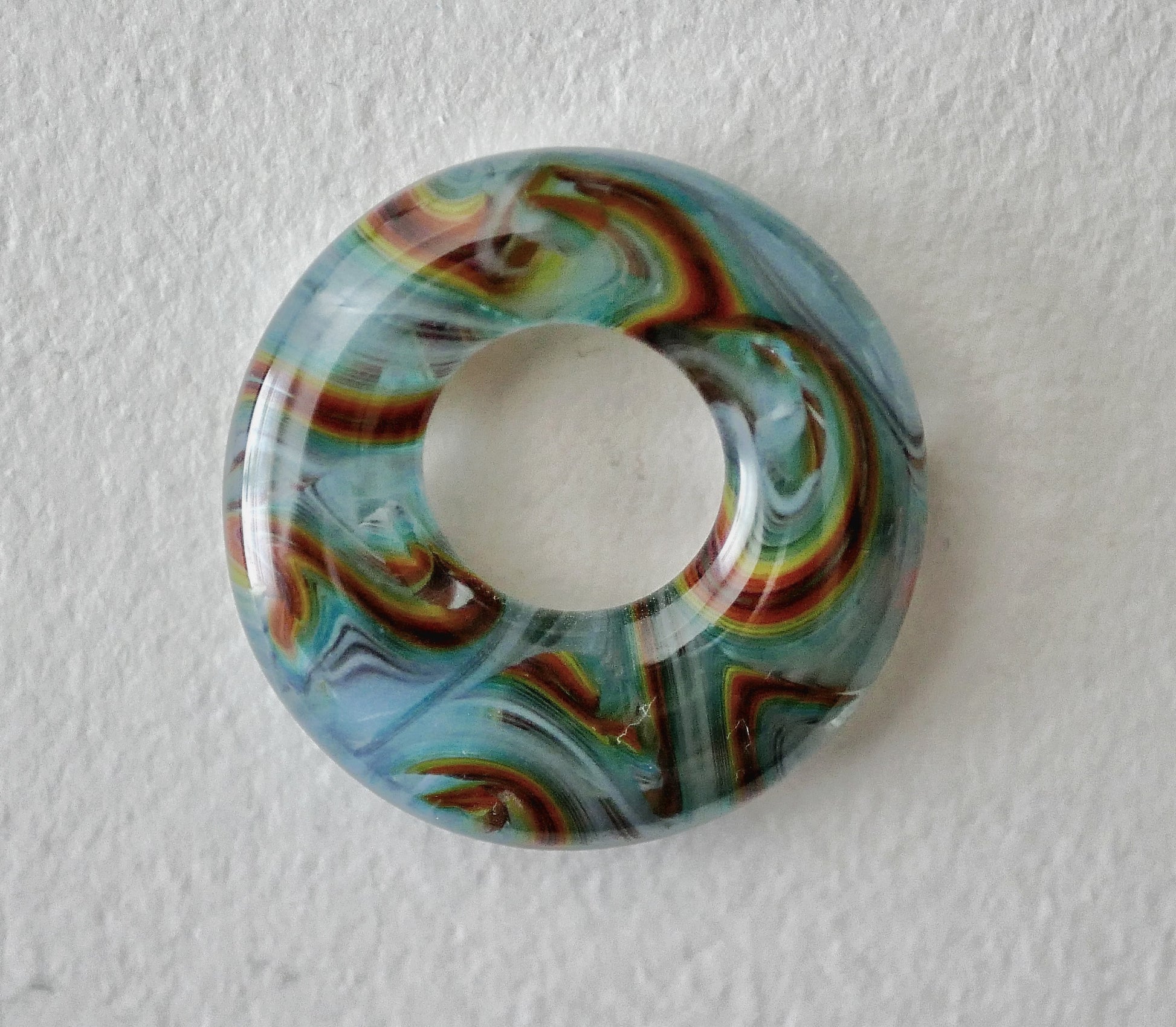 Handmade in my kiln by me! The swirling colors in these come from twisted glass cane that has been cut up and remelted.