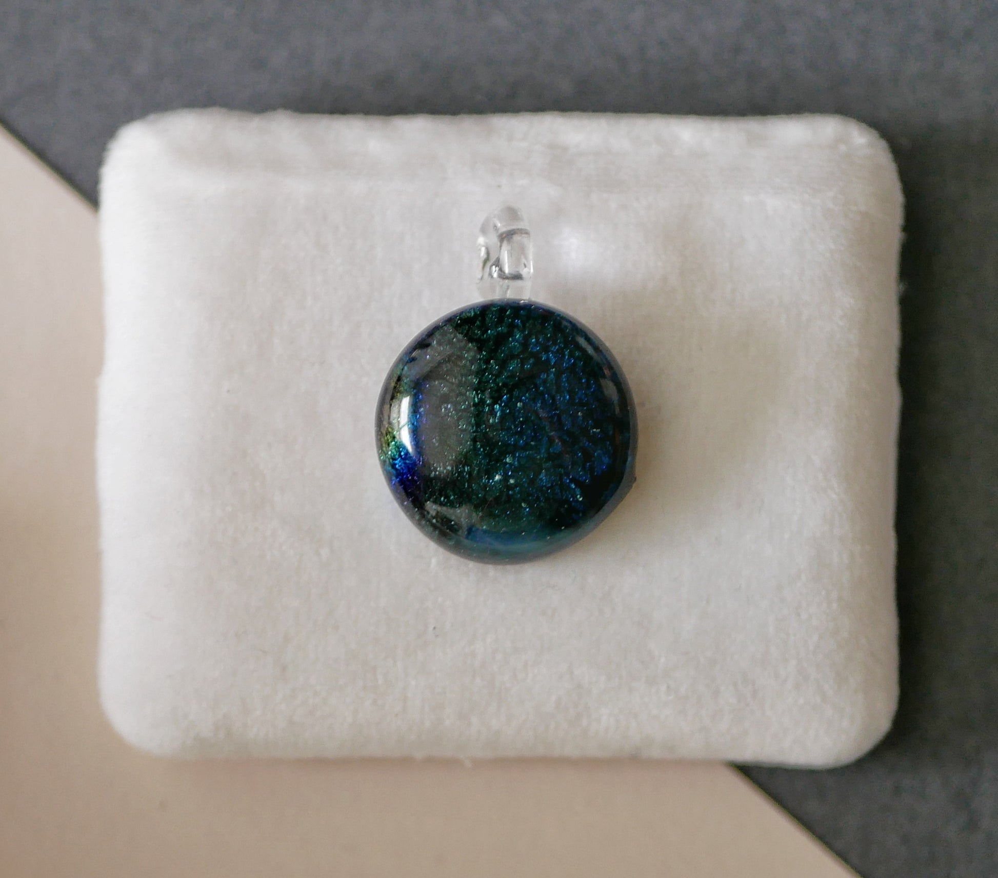 Handmade in my kiln by me! A small dichroic pendant with glass bail.