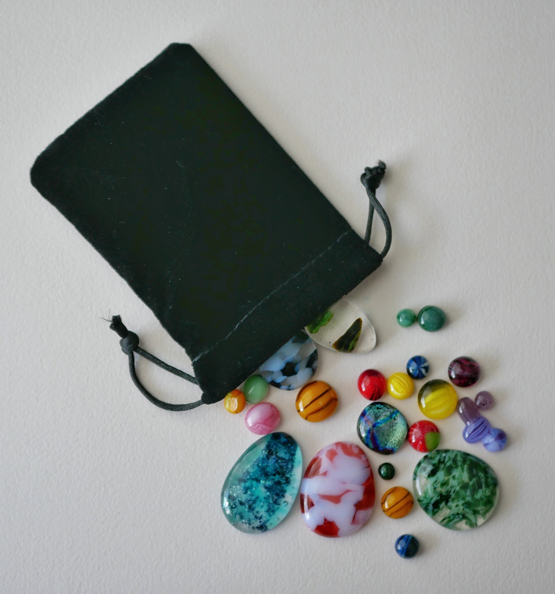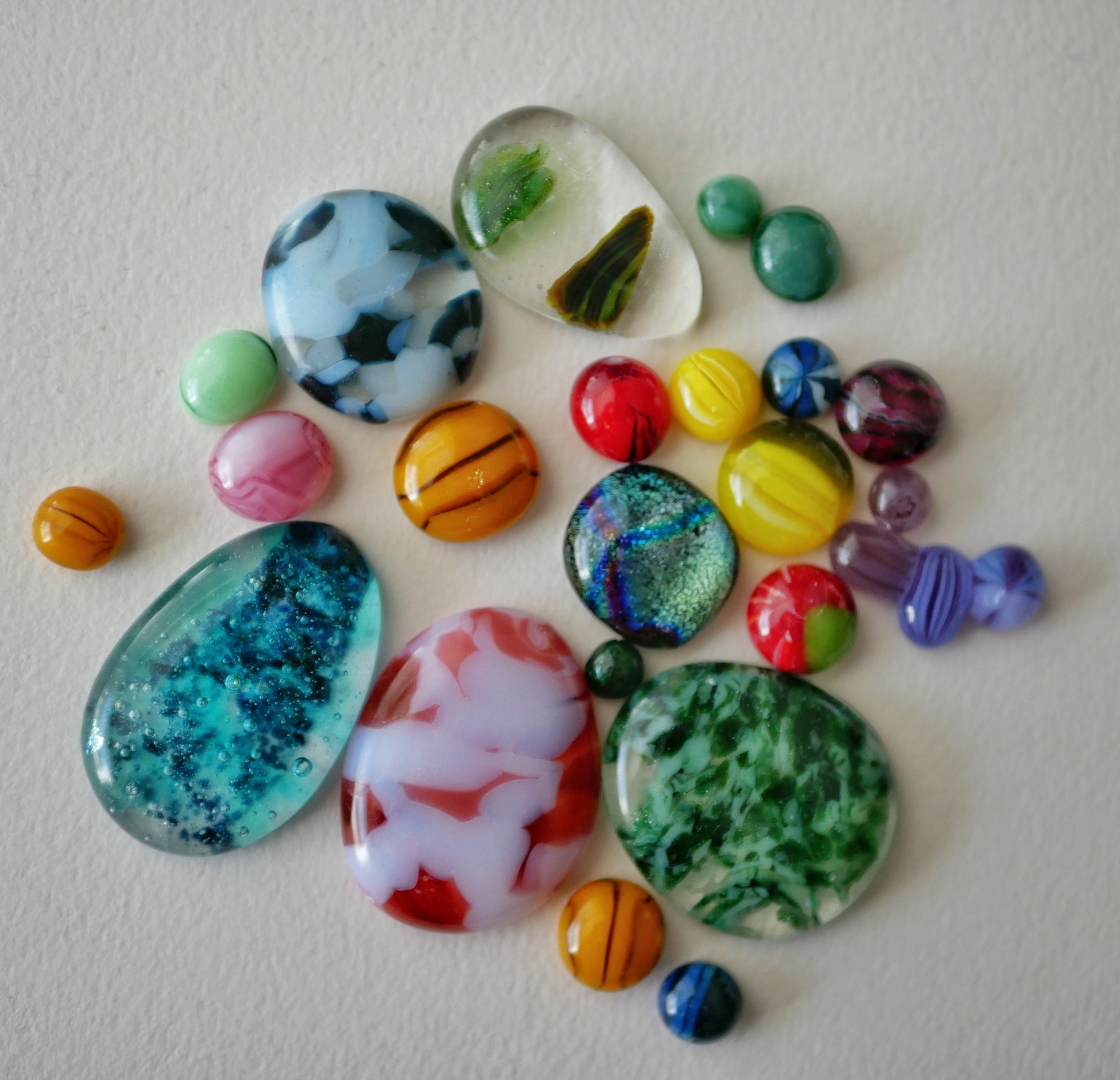 You'll get at least 10 glass pieces of a variety of sizes and designs. Some of them are seconds that didn't make it as jewelry because they blobbed weird, were too small, or otherwise didn't come out perfect; others are experiments I didn't pursue or pebbles made of scrap glass.