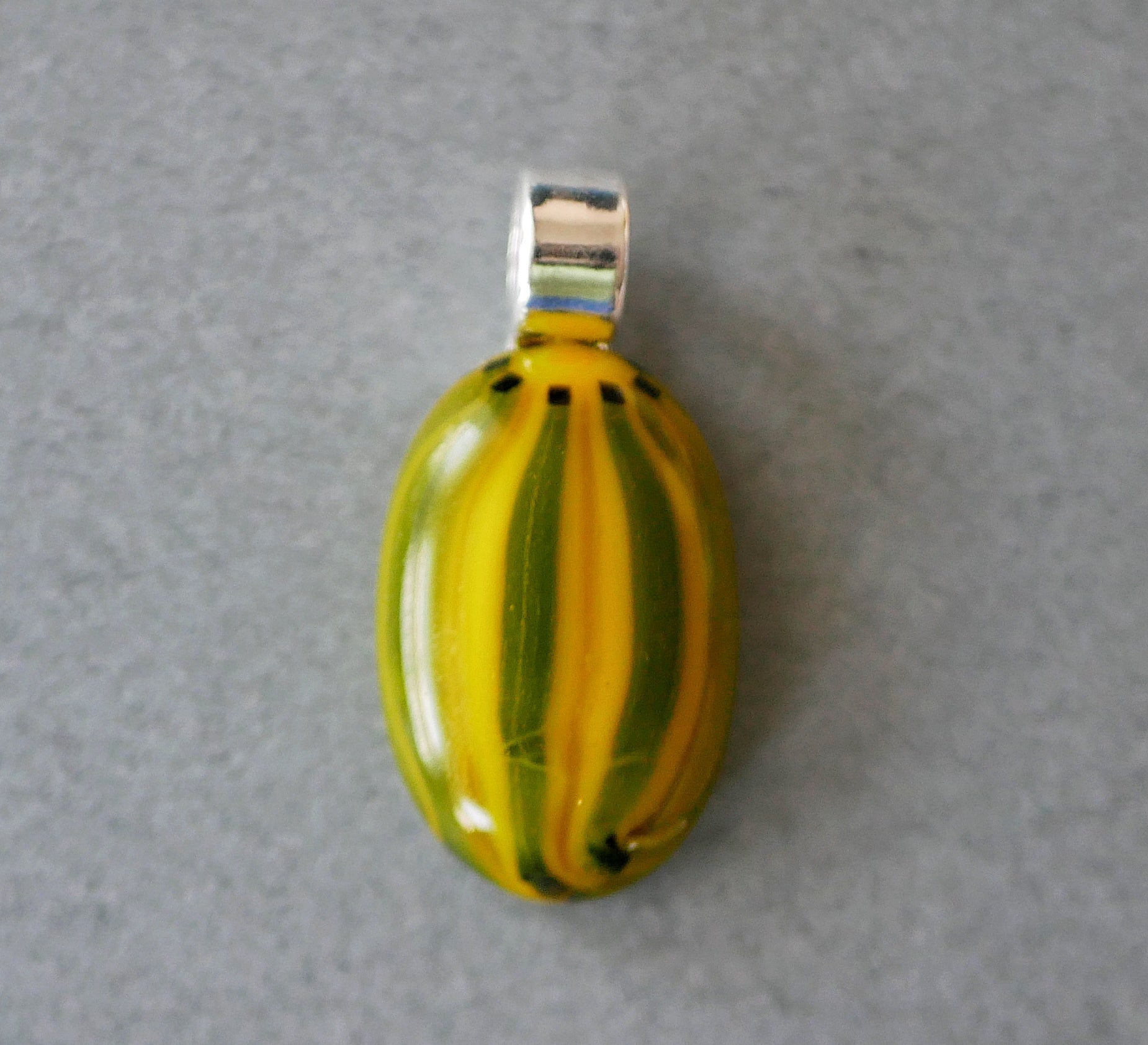 Handmade in my kiln by me! A pendant made from murrine scrap, creating a stripey pattern. These look a bit like sea cucumbers to me.