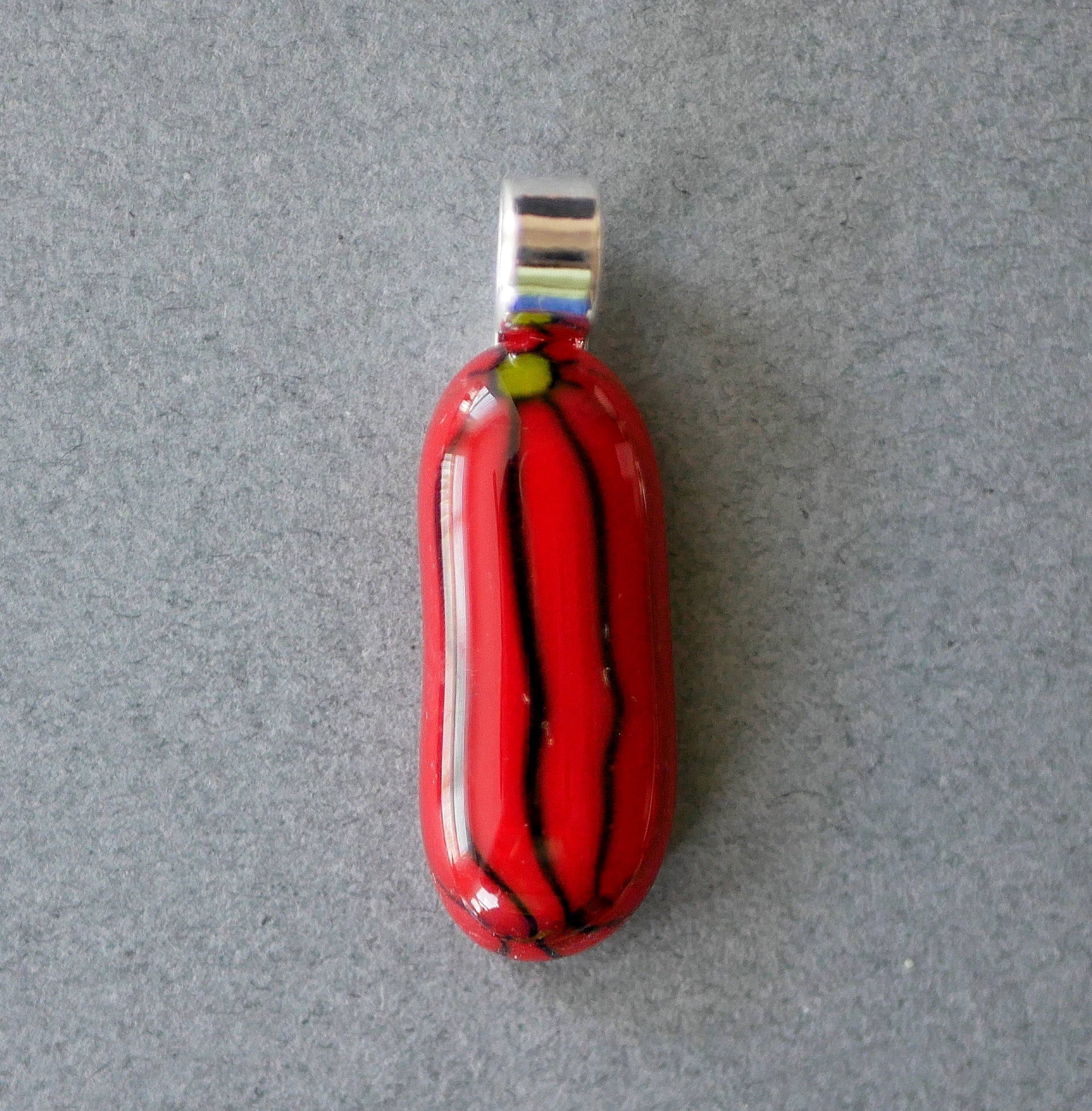 Handmade in my kiln by me! A pendant made from murrine scrap, creating a stripey pattern. These look a bit like sea cucumbers to me.
