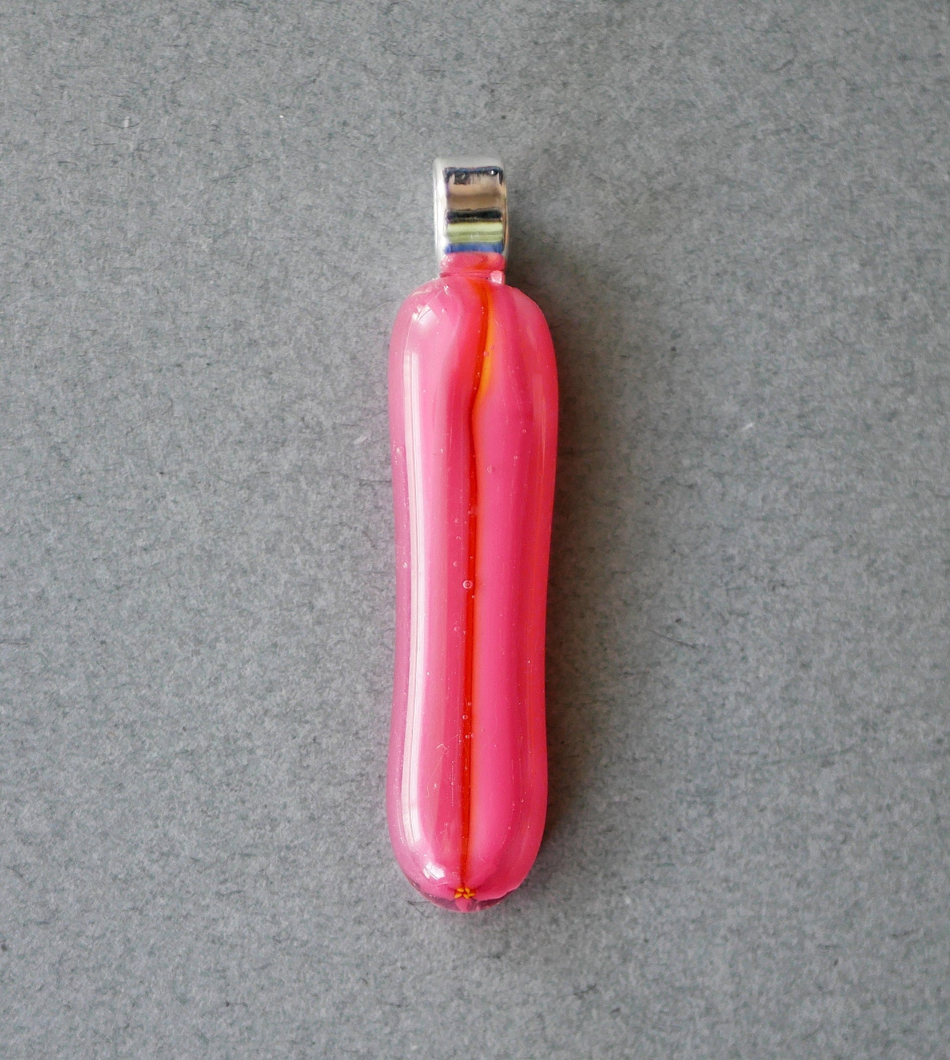 Handmade in my kiln by me! A pendant made from murrine scrap, creating a stripey pattern. These look a bit like sea cucumbers to me.